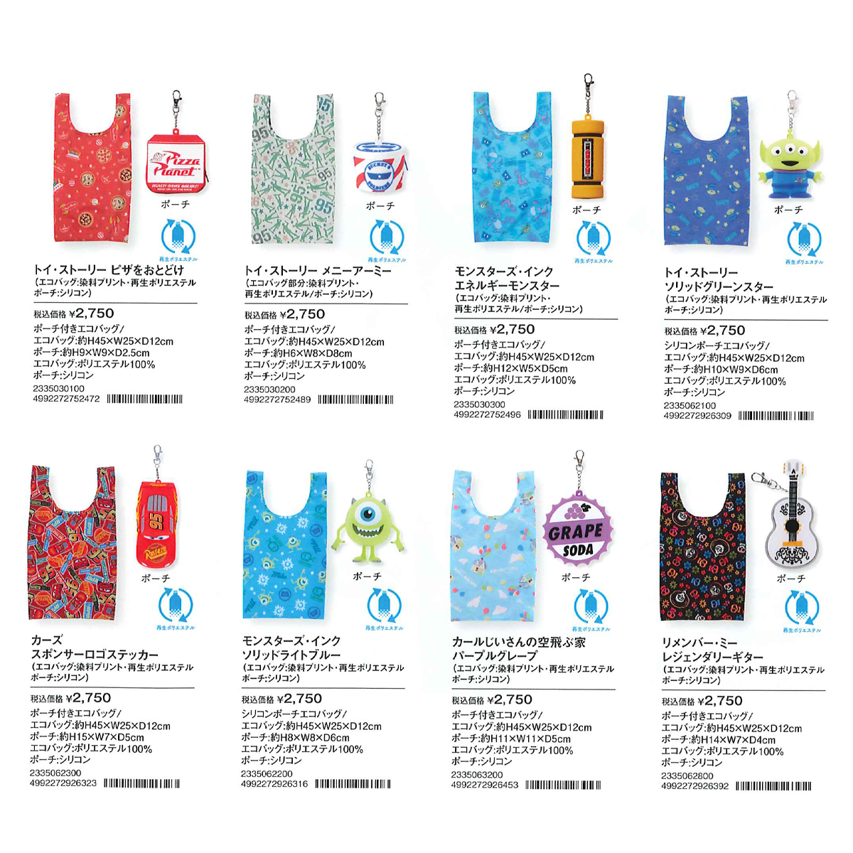 サイズ | 【エコバッグ】約H45×W25×D12cm 【ポーチ】 トイストーリー ピザをおとどけ:約H9×W9×D2.5cm トイストーリー メニーアーミー:約H6×W8×D8cm モンスターズインク エネルギーモンスター:約H12×W5×D5cm くまのプーさん ソリッドハニー:約H13×W7×D6cm トイストーリー ソリッドグリーンスター:約H10×W9×D6cm カーズ スポンサーロゴステッカー:約H15×W7×D5cm モンスターズインク ソリッドライトブルー:約H8×W8×D6cm カールじいさんの空飛ぶ家 パープルグレープ:約H11×W11×D5cm リメンバー・ミー レジェンダリーギター:約H14×W7×D4cm |