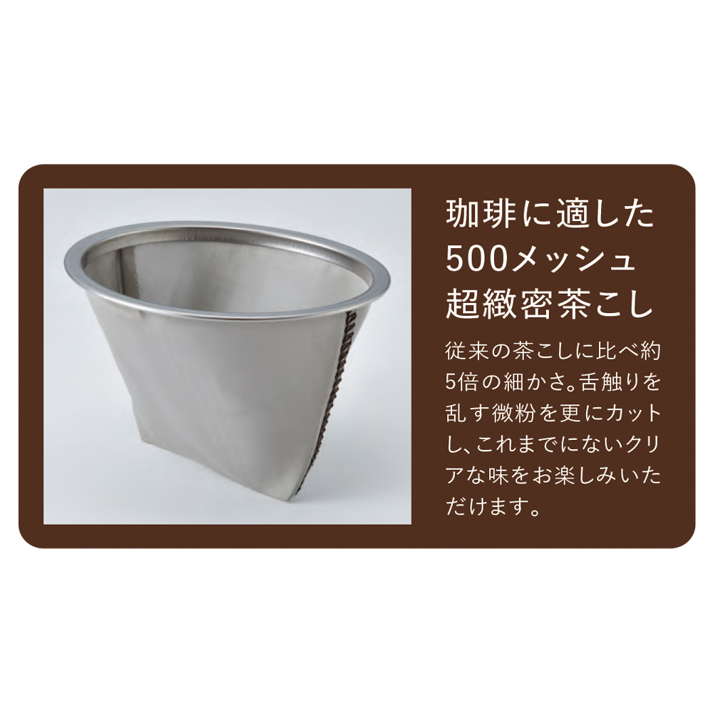 細かなメッシュフィルター(かご網タイプ)で、 深煎りのコーヒー豆から浅煎りの豆まで様々なコーヒーに対応可能です。