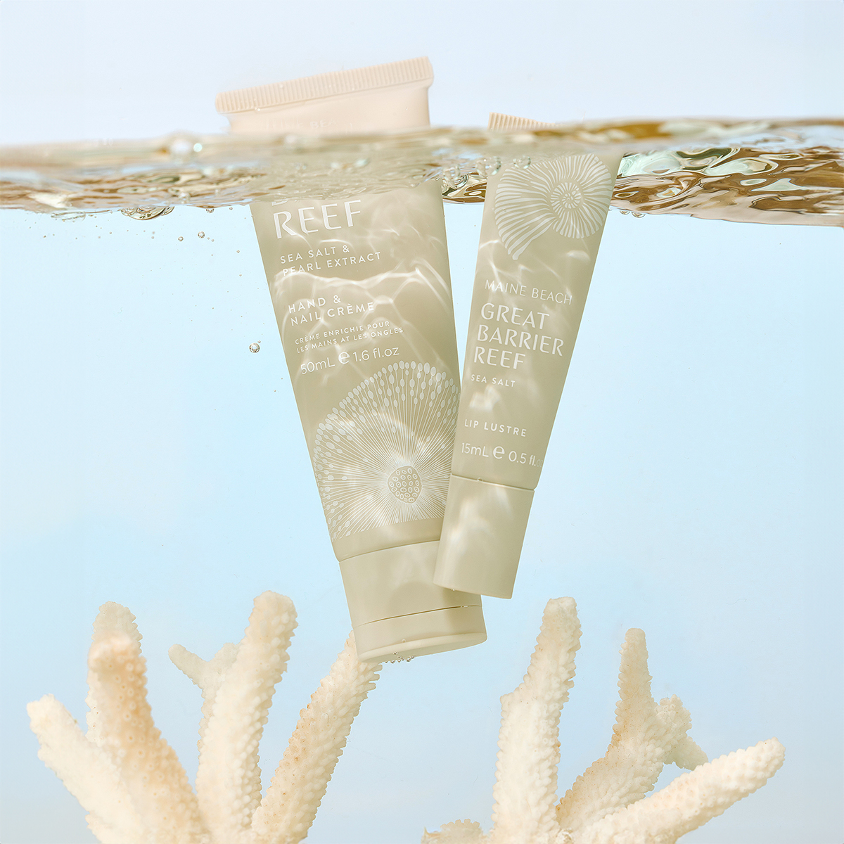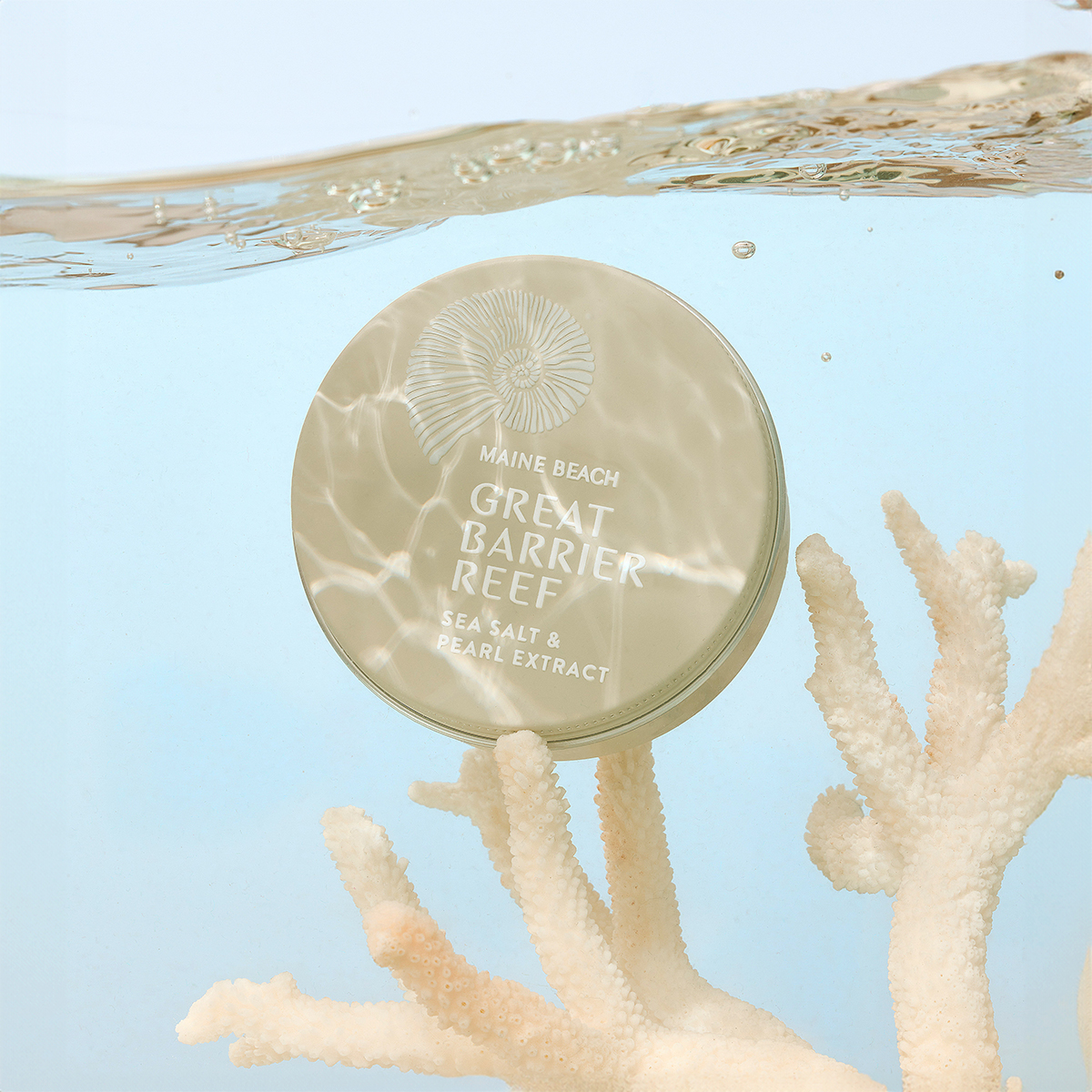 グレートバリアリーフの海塩と真珠エキスからインスピレーションを受けたライトグレーをテーマカラーとし、サンゴの白化という差し迫った問題を提起するための色でもあります。サンゴ、オウムガイ、海藻などのイラストがシームレスに配置されており、海の生態系の保護の意識についても高めてほしいと思う取り組みを表すパッケージでもあります。