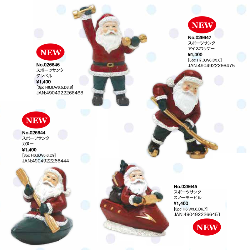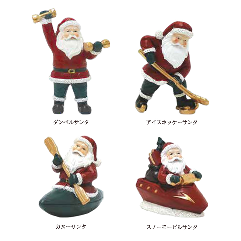 | サイズ | バーベルサンタ:H6.6×W5.5×D2.8cm バスケットサンタ:H7.2×W5.6×D3.9cm スケボーサンタ:H6.6×W7.7×D4cm サッカーサンタ:H8.2×W6.5×D4.4cm ベースボールサンタ:H8.7×W4.7×D2.9cm |