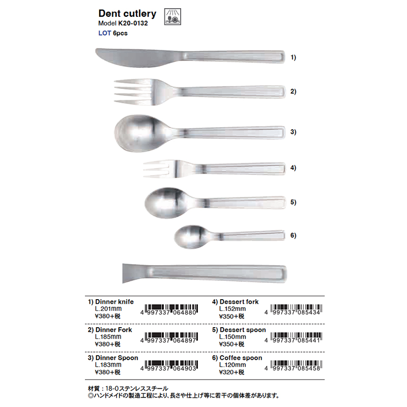 | サイズ | 【DENT DINNER KNIFE】L.201mm 【DENT DINNER FORK】L.185mm 【DENT DINNER SPOON】L.183mm 【DENT DESSERT FORK】L.152mm 【DENT DESSERT SPOON】L.150mm 【DENT COFFEE SPOON】L.120mm |
