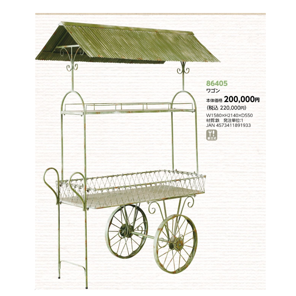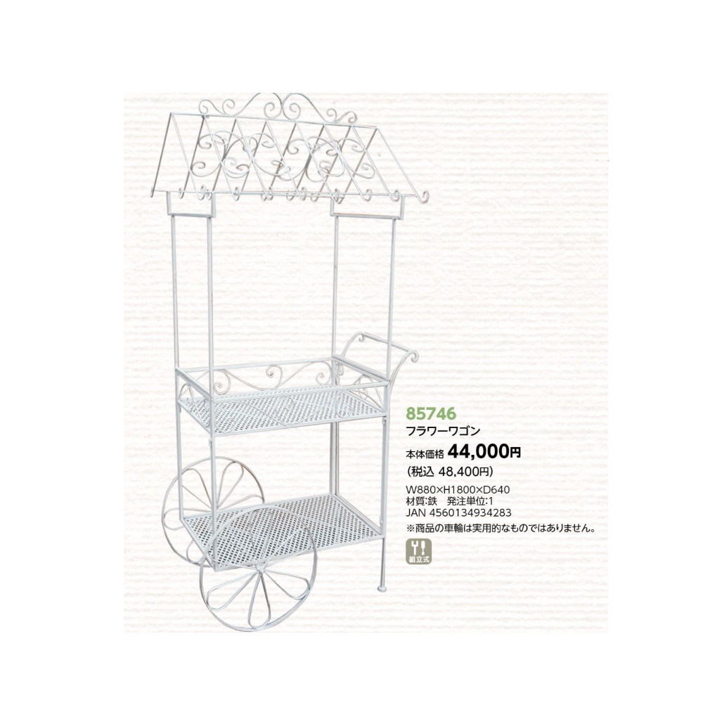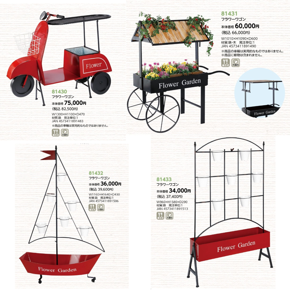 | サイズ | 【81430 フラワーワゴン】W1300×H1100×D470 【81431 フラワーワゴン】W1010×H1090×D600 【81432 フラワーワゴン】W1160×H1640×D430 【81433 フラワーワゴン】W960×H1580×D290 【85746 フラワーワゴン】W880×H1800×D640 【86405 ワゴン】W1580×H2140×D550 |