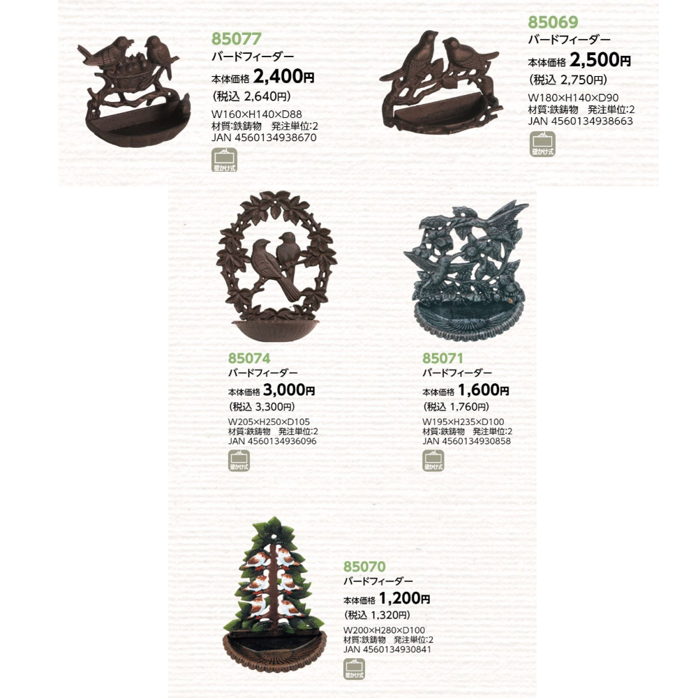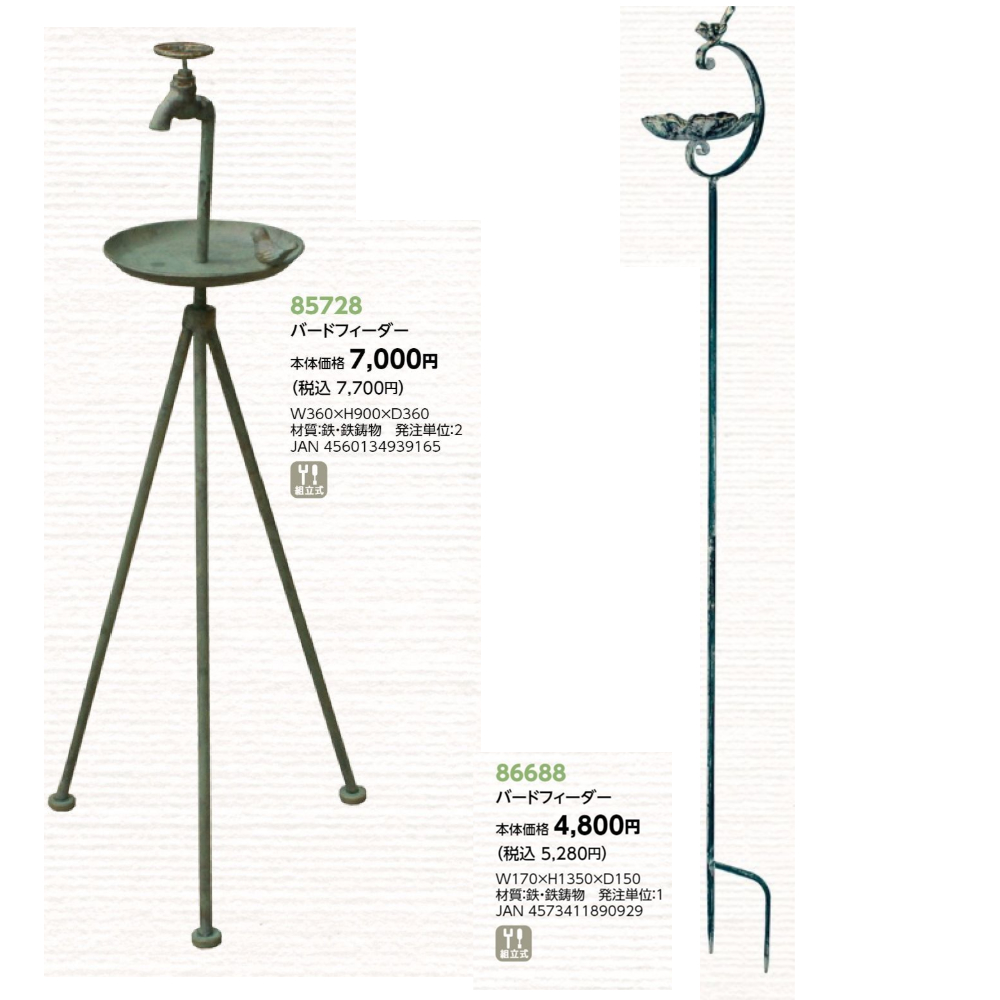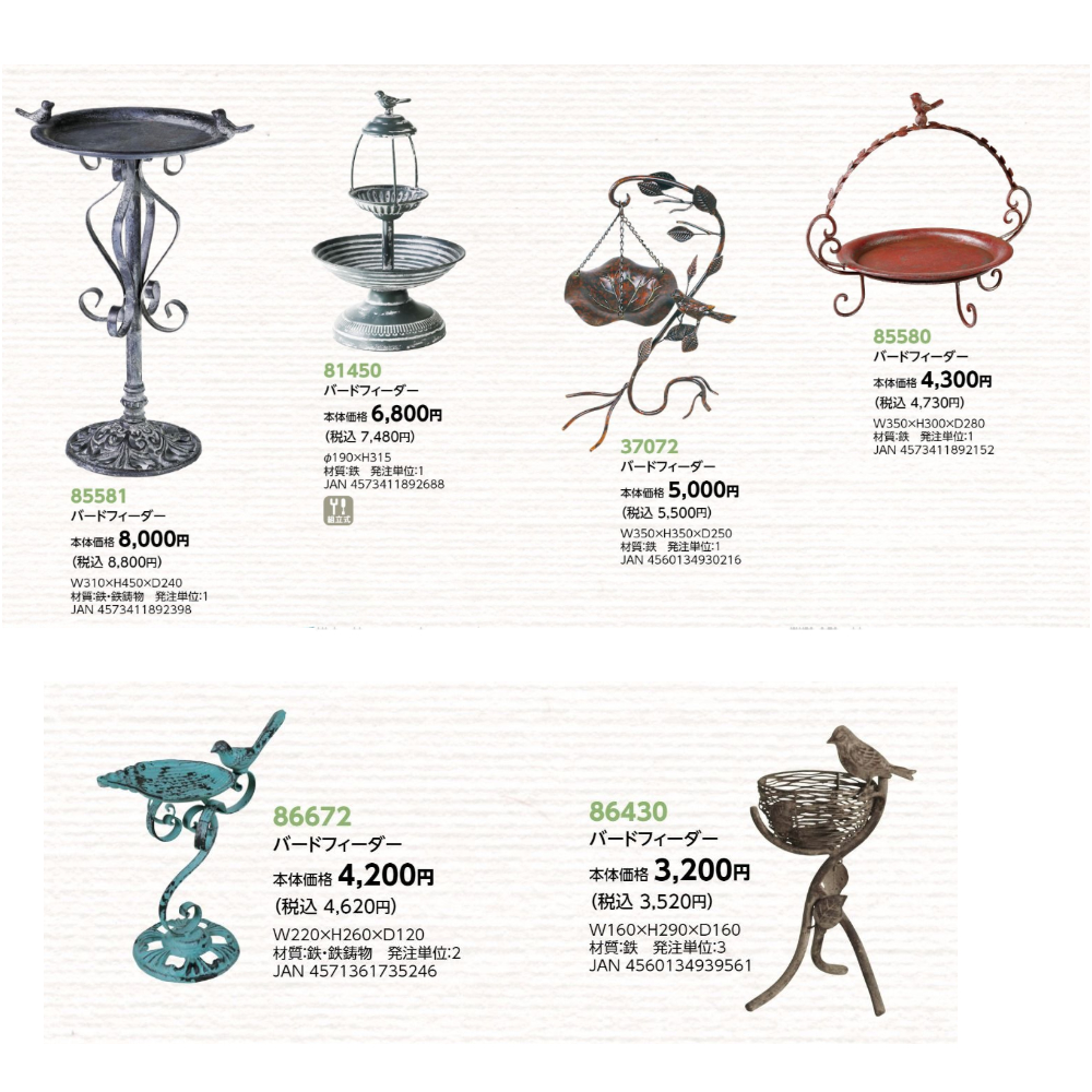 サイズ | 【37072 バードフィーダー】W350×H350×D250 【81450 バードフィーダー】φ190×H315 【85069 バードフィーダー】W180×H140×D90 【85070 バードフィーダー】W200×H280×D100 【85071 バードフィーダー】W195×H235×D100 【85074 バードフィーダー】W205×H250×D105 【85077 バードフィーダー】W160×H140×D88 【85580 バードフィーダー】W350×H300×D280 【85581 バードフィーダー】W310×H450×D240 【85728 バードフィーダー】W360×H900×D360 【86430 バードフィーダー】W160×H290×D160 【86672 バードフィーダー】W220×H260×D120 【86688 バードフィーダー】W170×H1350×D150 |