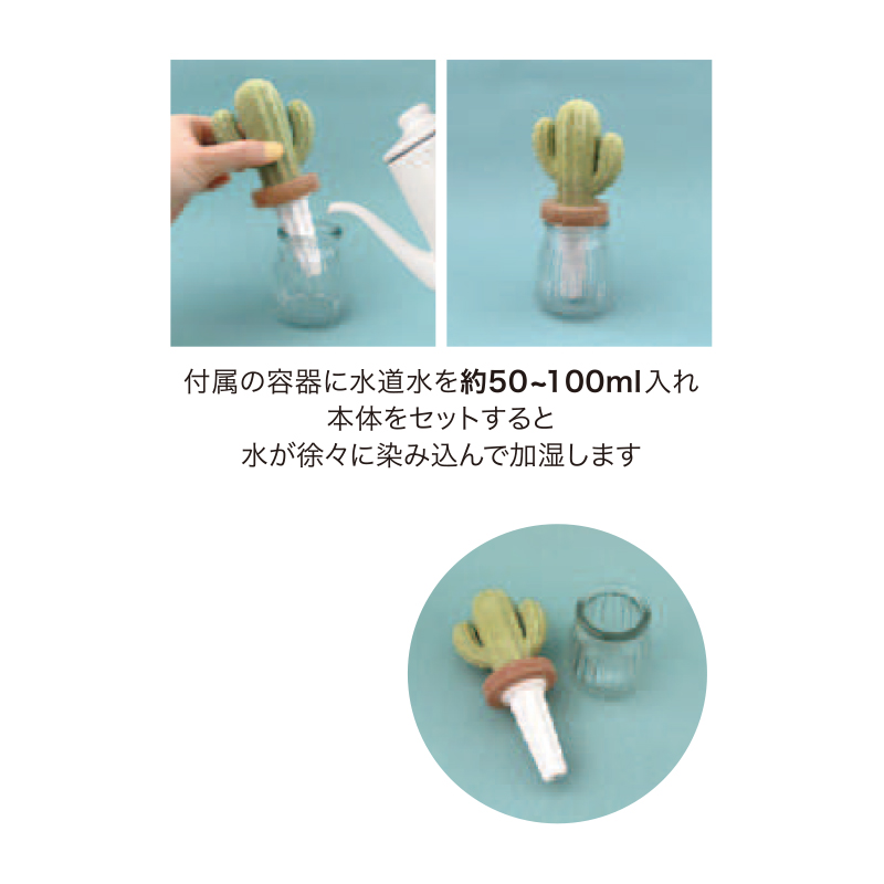 付属の容器に水道水を約50~100ml入れ、本体とセットすると、水が徐々に染み込んで加湿します。