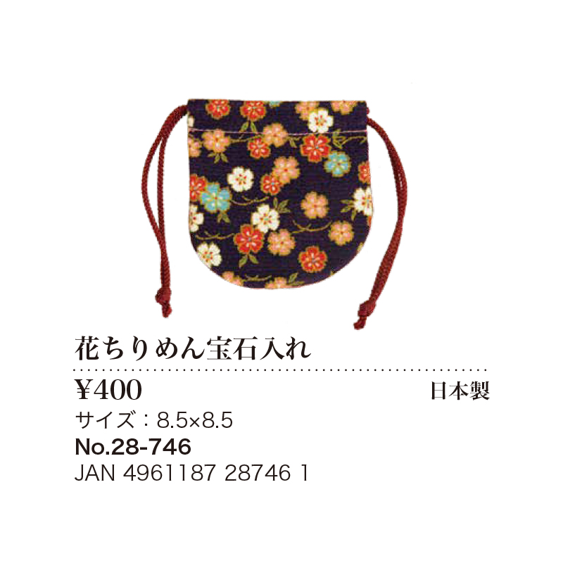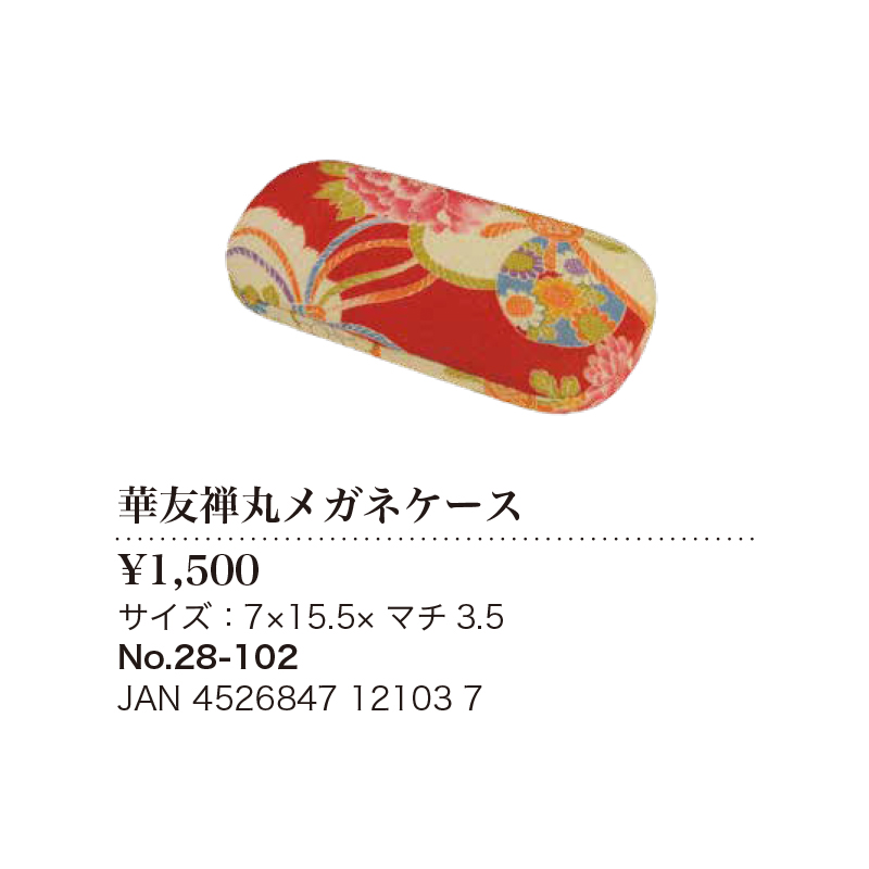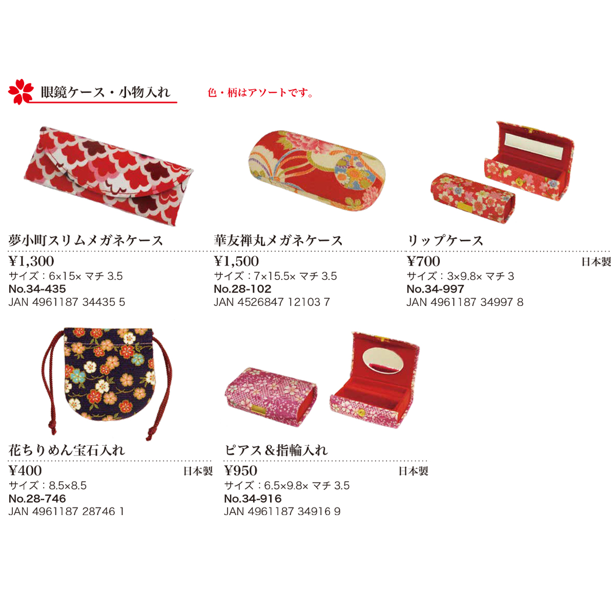 サイズ | 【夢小町スリムメガネケース】6×15×マチ3.5cm 【華友禅丸メガネケース】7×15.5×マチ3.5cm 【リップケース】3×9.8×マチ3cm 【花ちりめん宝石入れ】8.5×8.5cm 【ピアス&指輪入れ】6.5×9.8×マチ3.5cm |