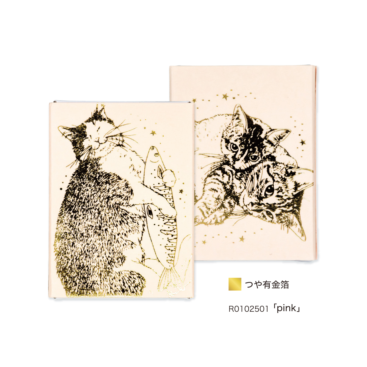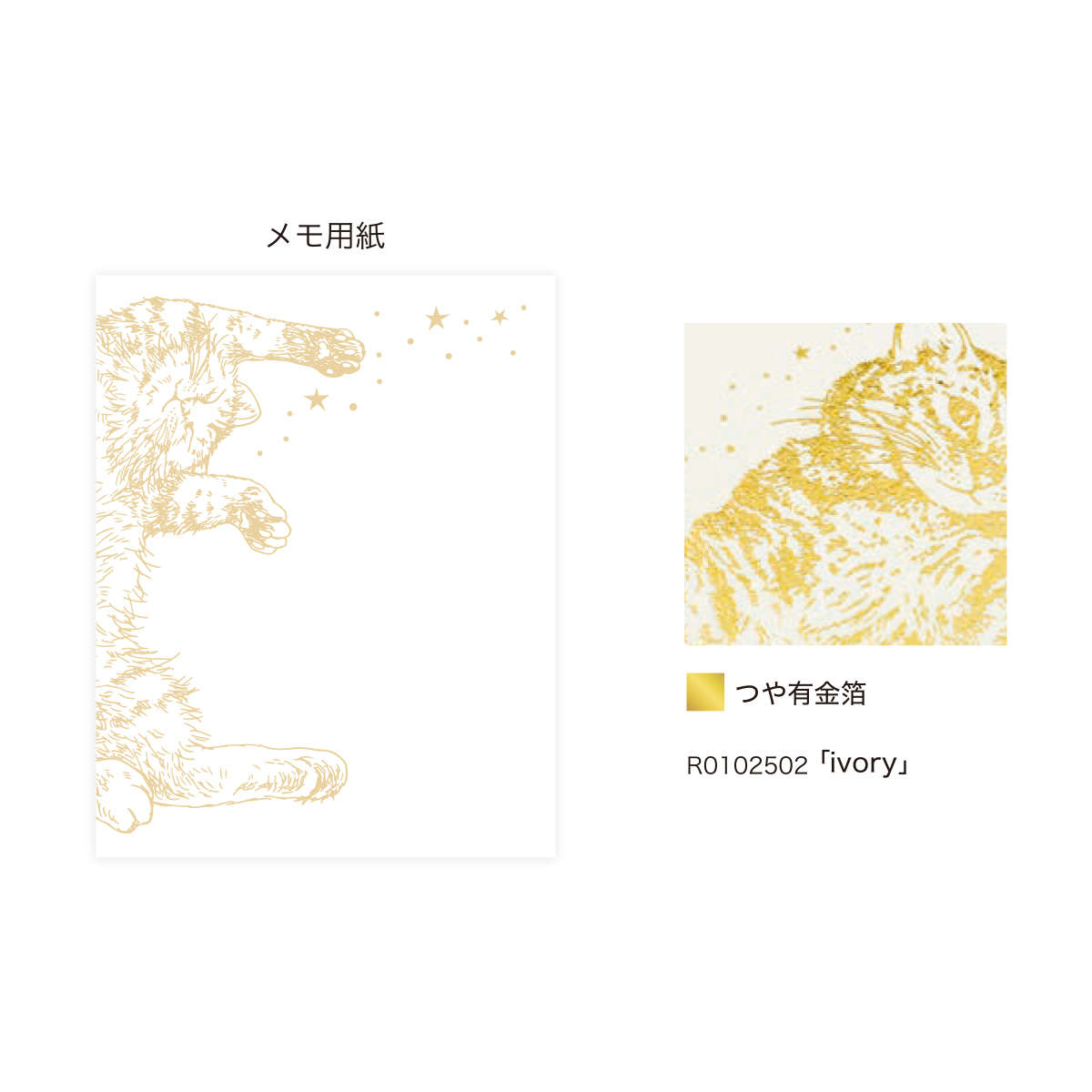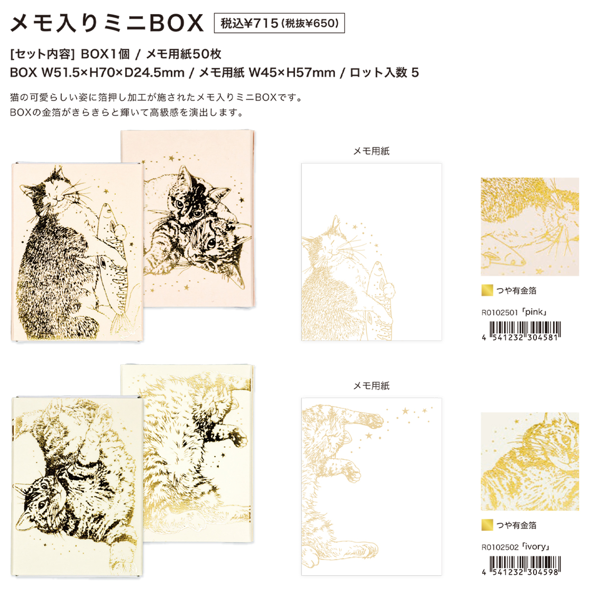 猫の可愛らしい姿に箔押し加工が施されたメモ入りミニBOXです。