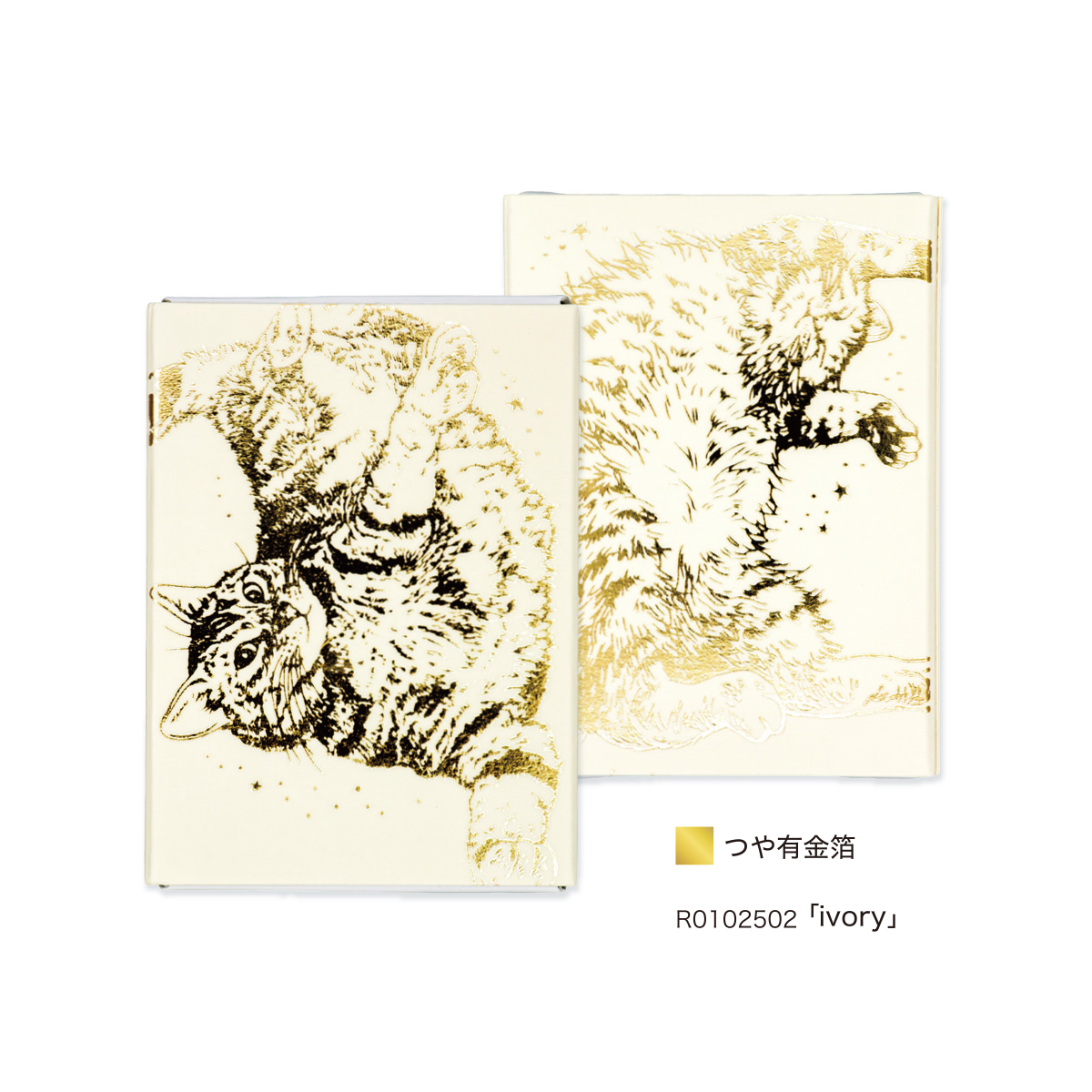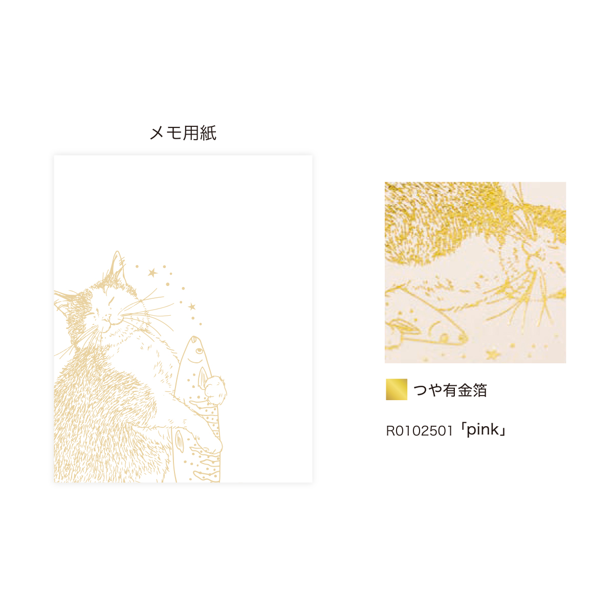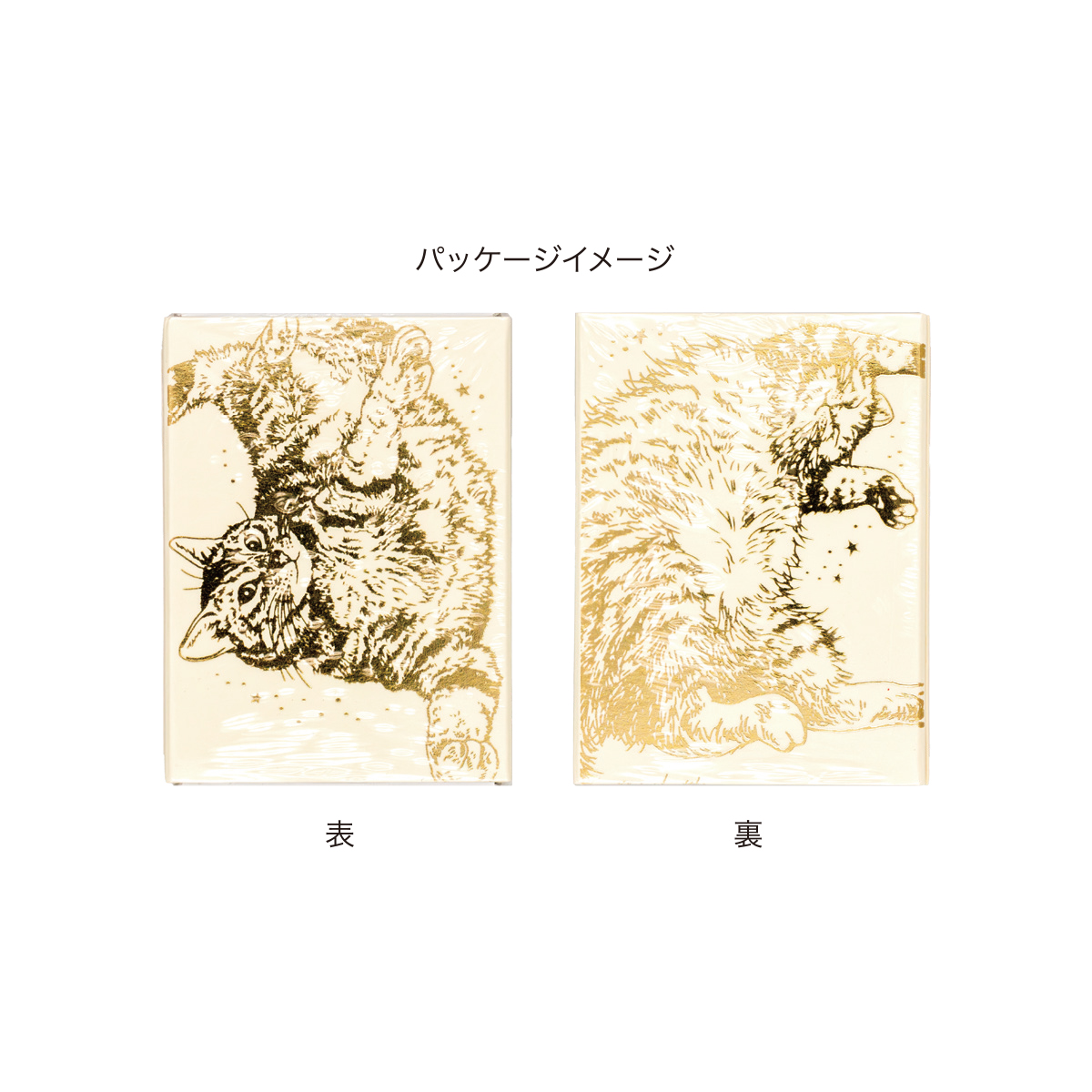 猫の可愛らしい姿に箔押し加工が施されたメモ入りミニBOXです。