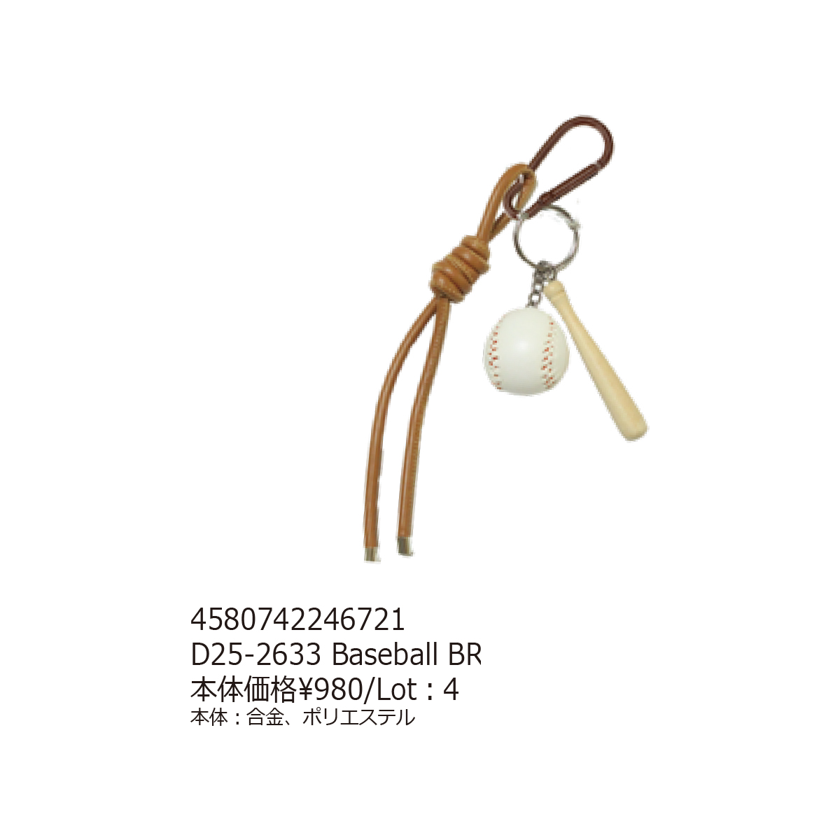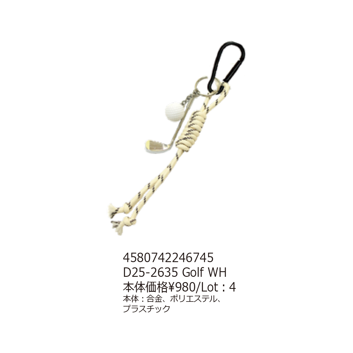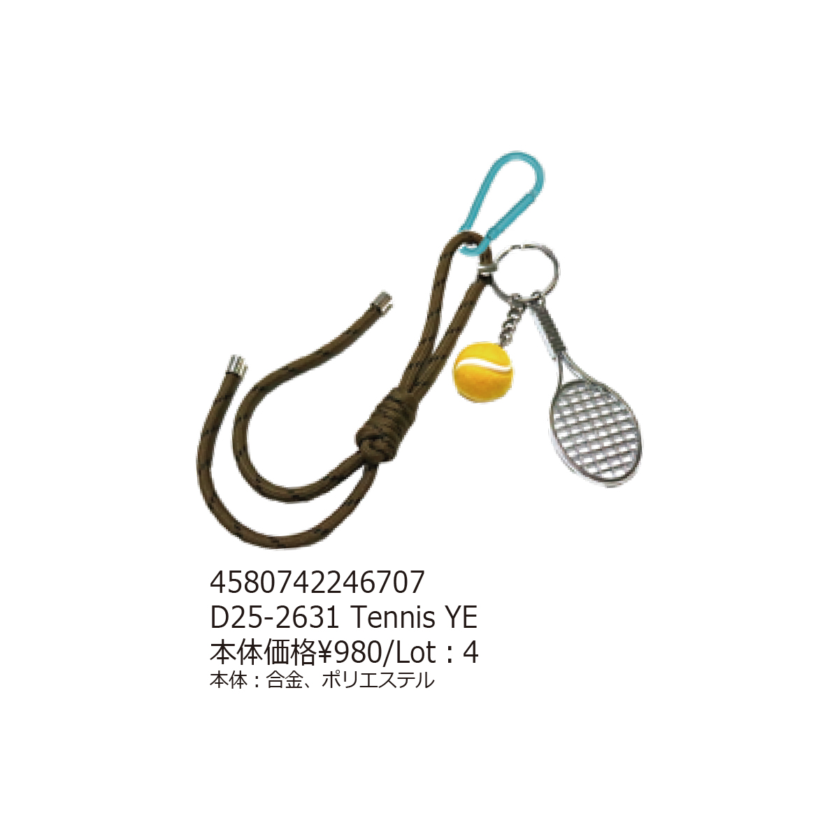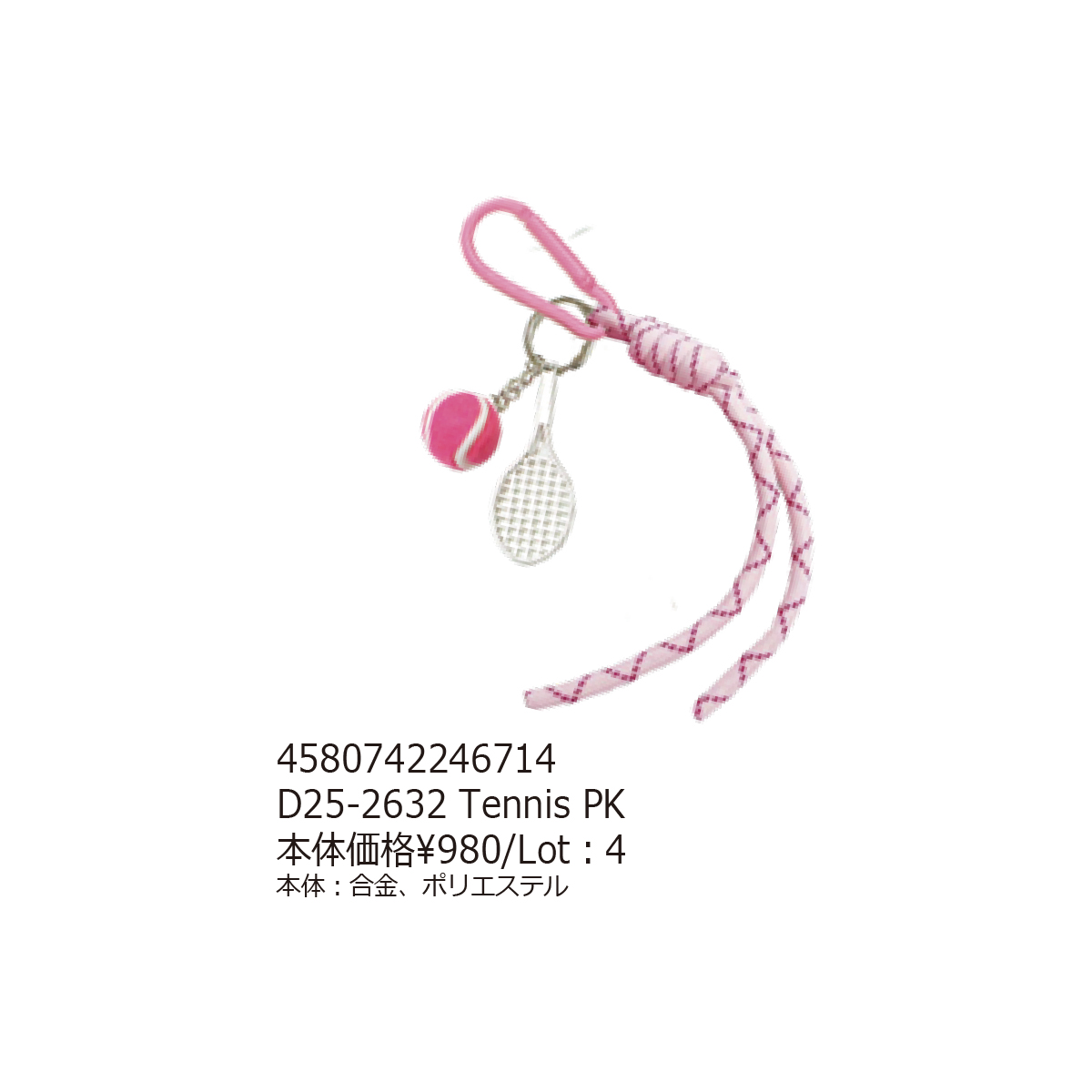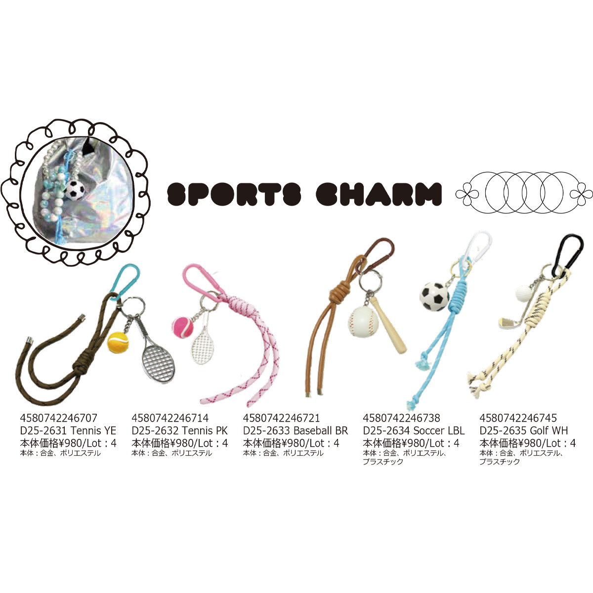 素材 | 【Tennis YE】合金、ポリエステル 【Tennis PK】合金、ポリエステル 【Baseball BR】合金、ポリエステル 【Soccer LBL】合金、ポリエステル、プラスチック 【Golf WH】合金、ポリエステル、プラスチック |
