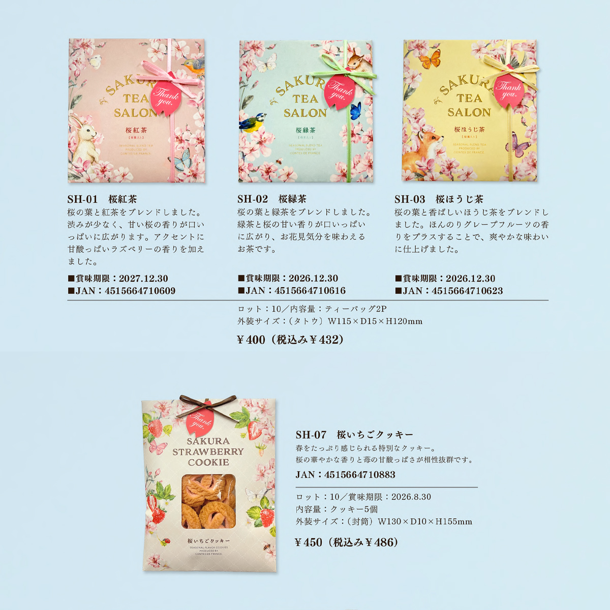 サイズ | 【SAKURA TEA SALON 桜紅茶/桜緑茶/桜ほうじ茶】 外装サイズ(タトウ):W115×D15×H120mm 内容量:ティーバッグ2P 【SAKURA TEA SALON 桜いちごクッキーセット】 外装サイズ(化粧箱):W210×D25×H140mm 内容量:ティーバッグ2P、クッキー5個 【SAKURA TEA SALON 桜いちごクッキー】 外装サイズ(封筒):W130×D10×H155mm 内容量:クッキー5個 |