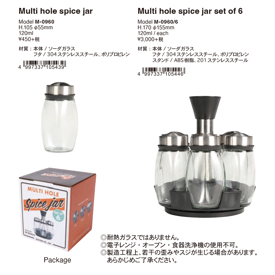 サイズ | 【MULTI HOLE SPICE JAR】 H.105mm W.55mm D.55mm 容量:120ml 【MULTI HOLE SPICE JAR SET OF 6】 スタンド:H.170mm φ155mm 容器/1pc:H.105mm W.55mm D.55mm 容量/1pc:120ml |
