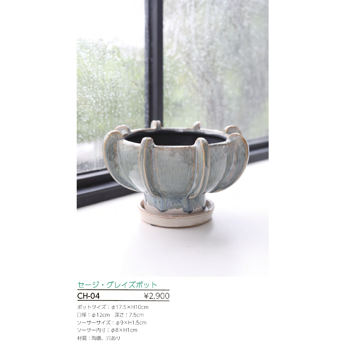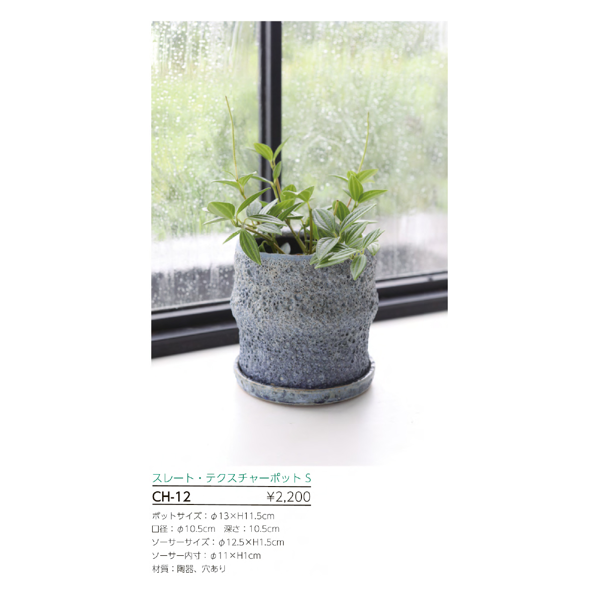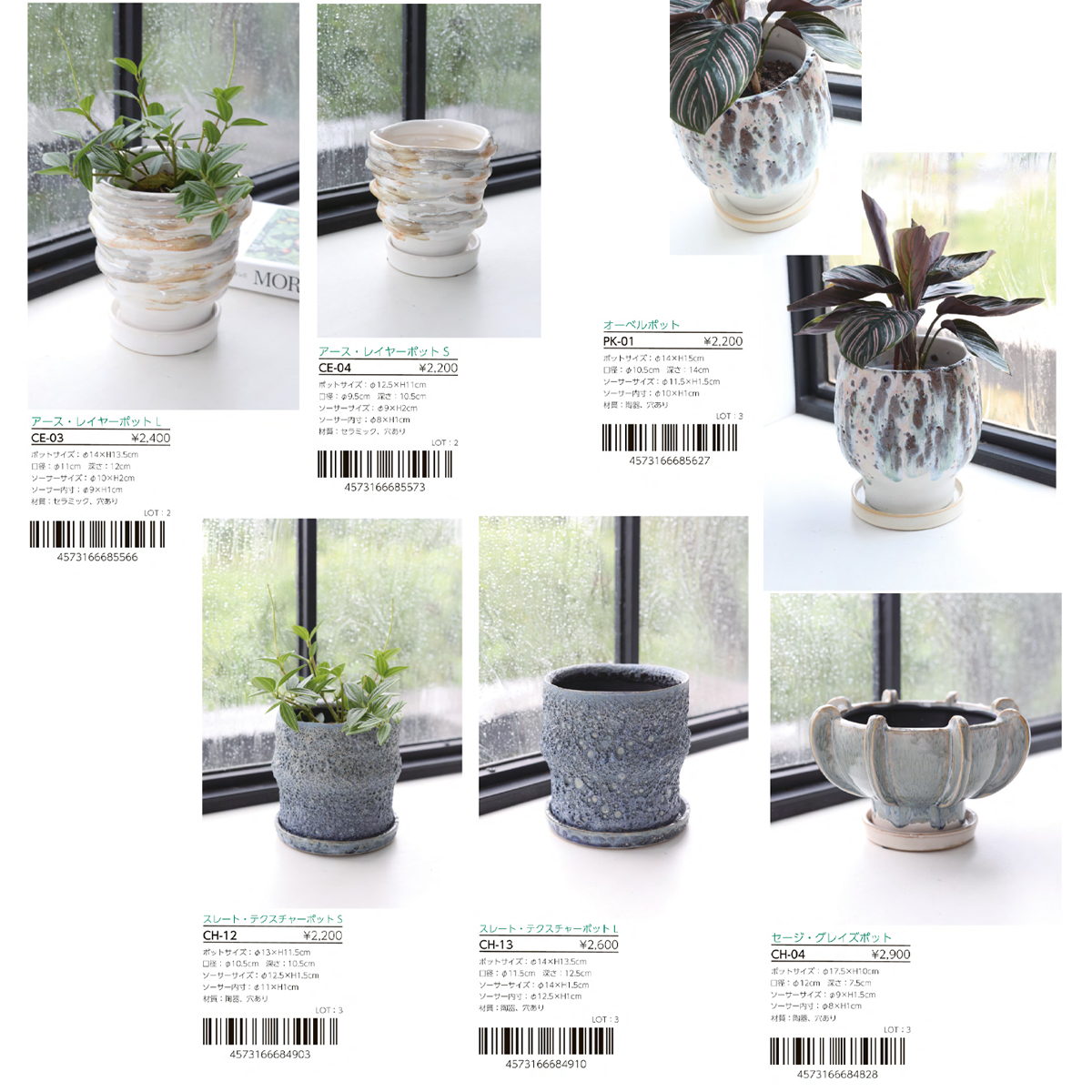 CE-04 アース・レイヤーポット S:セラミック、穴あり CH-12 スレート・テクスチャーポット S:陶器、穴あり CH-13 スレート・テクスチャーポット L:陶器、穴あり CH-04 セージ・グレイズポット:陶器、穴あり PK-01 オーベルポット:陶器、穴あり |