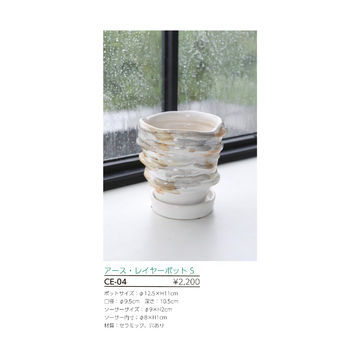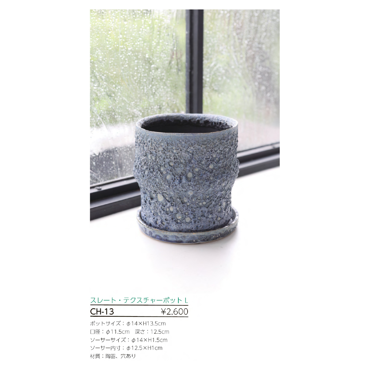 CE-04 アース・レイヤーポット S:W12.5×H11 CH-12 スレート・テクスチャーポット S:W13×H11.5 CH-13 スレート・テクスチャーポット L:W14×H13.5 CH-04 セージ・グレイズポット:W17.5×H10 PK-01 オーベルポット:W14×H15 |