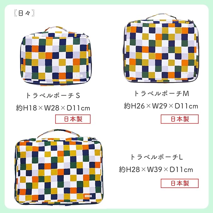 サイズ | トラベルポーチS:約H18×W28×D11cm トラベルポーチM:約H26×W29×D11cm トラベルポーチL: 約H28×W39×D11cm |