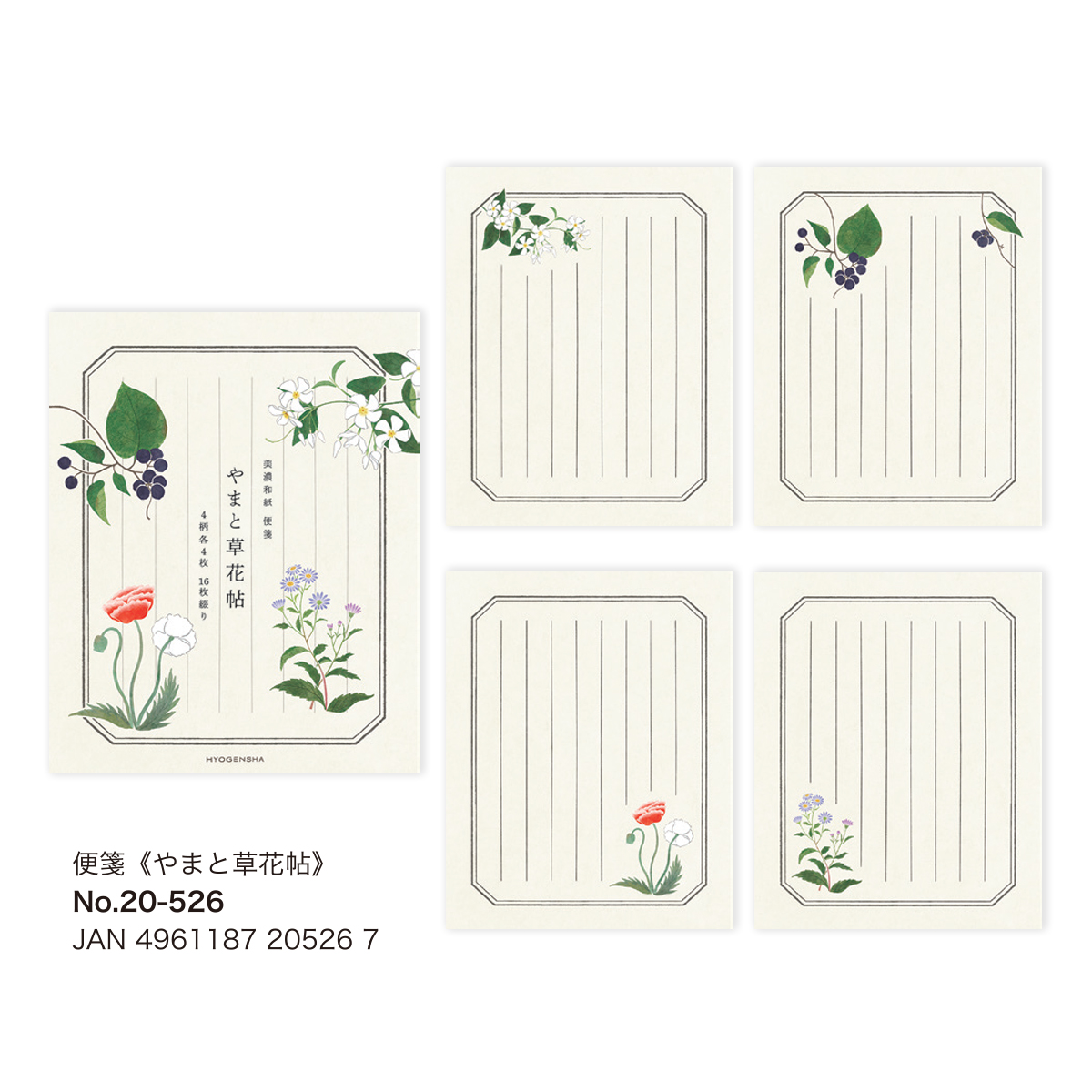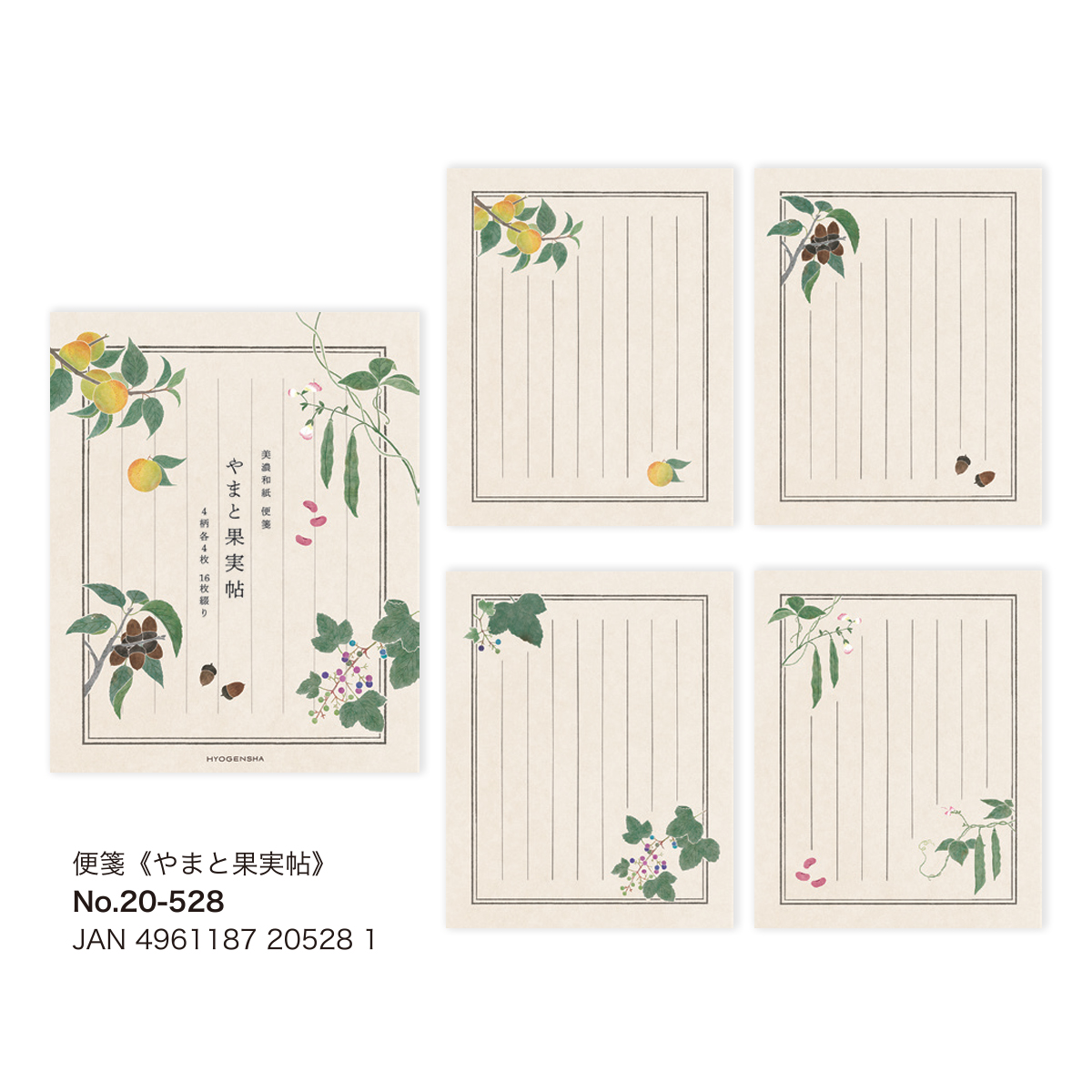 | サイズ | 【便箋】 4柄 各4枚 16枚綴 145×181mm 【封筒】 1柄 8枚入 95×174mm |