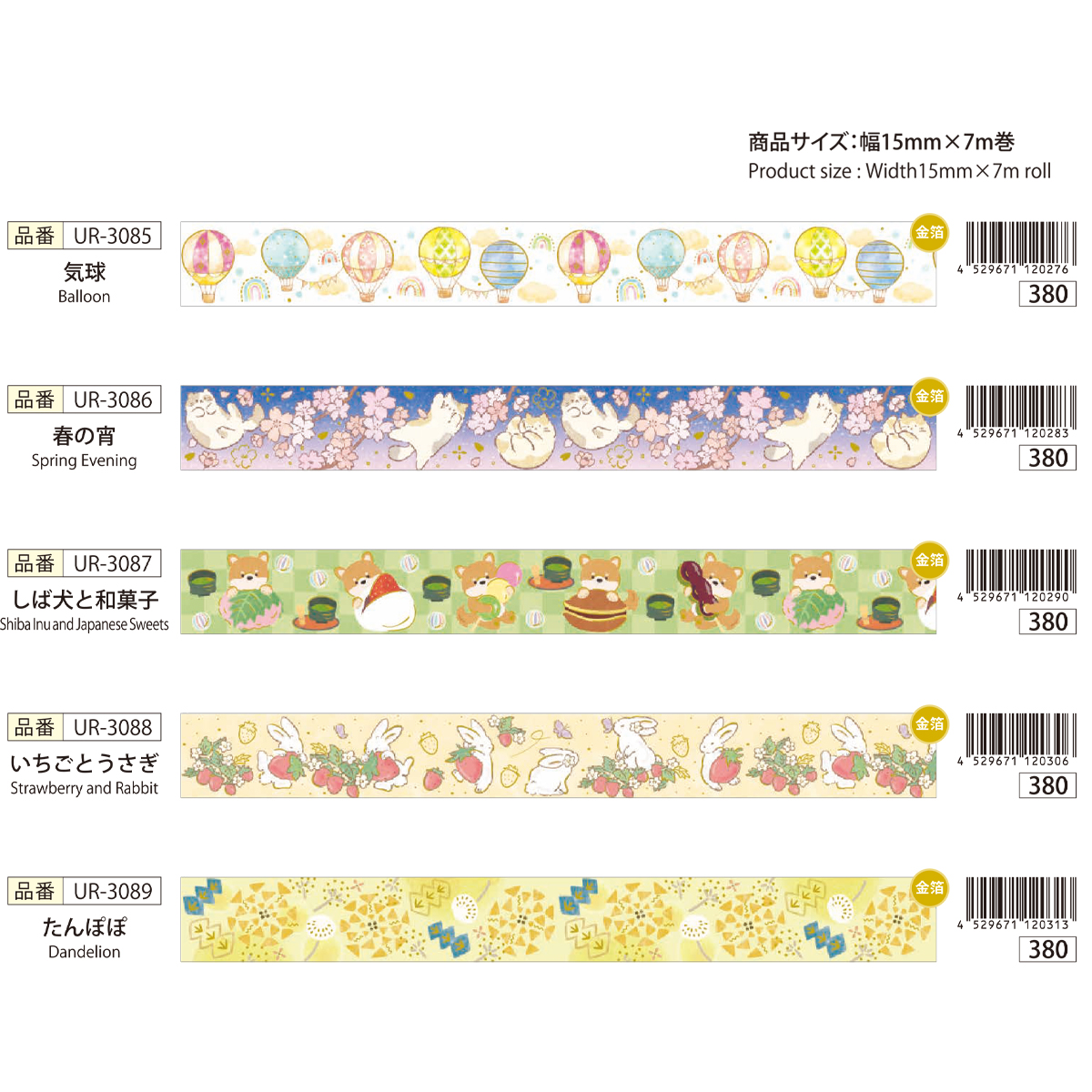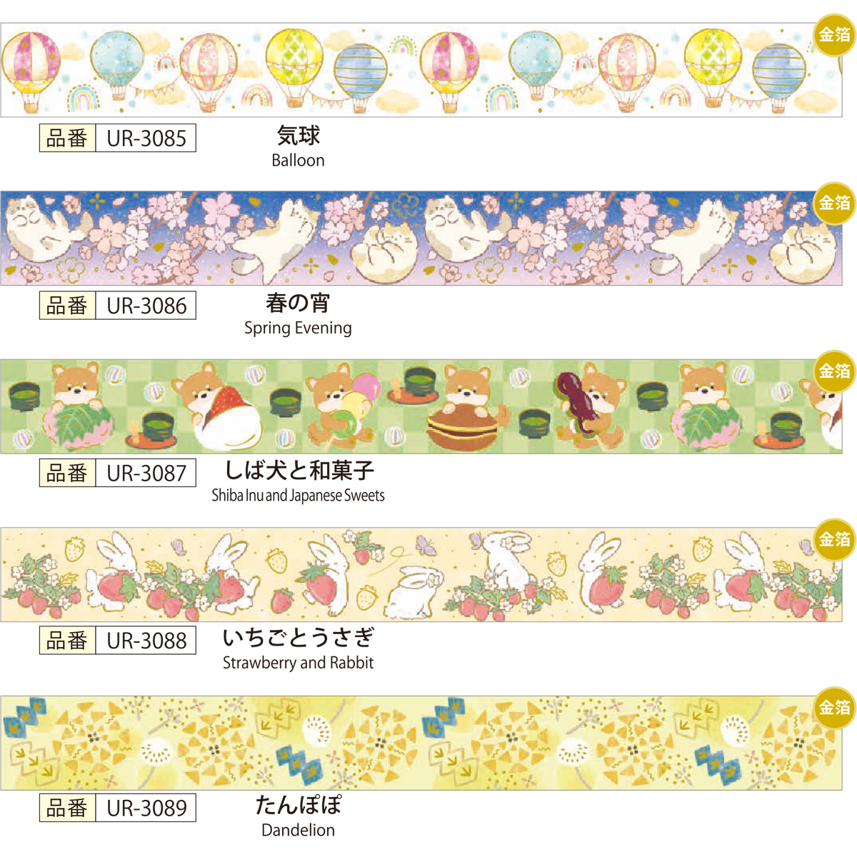 【SAIEN】オリジナルシリーズ 金箔&銀箔 マスキングテープ15mm 和紙 柴犬&うさぎ&たんぽぽ