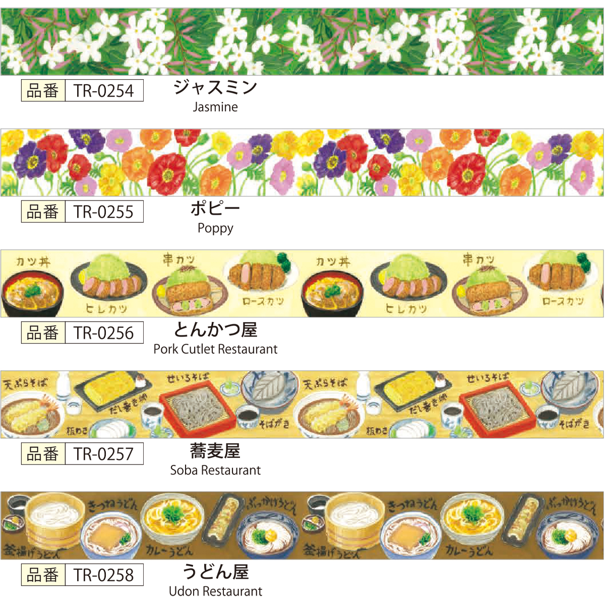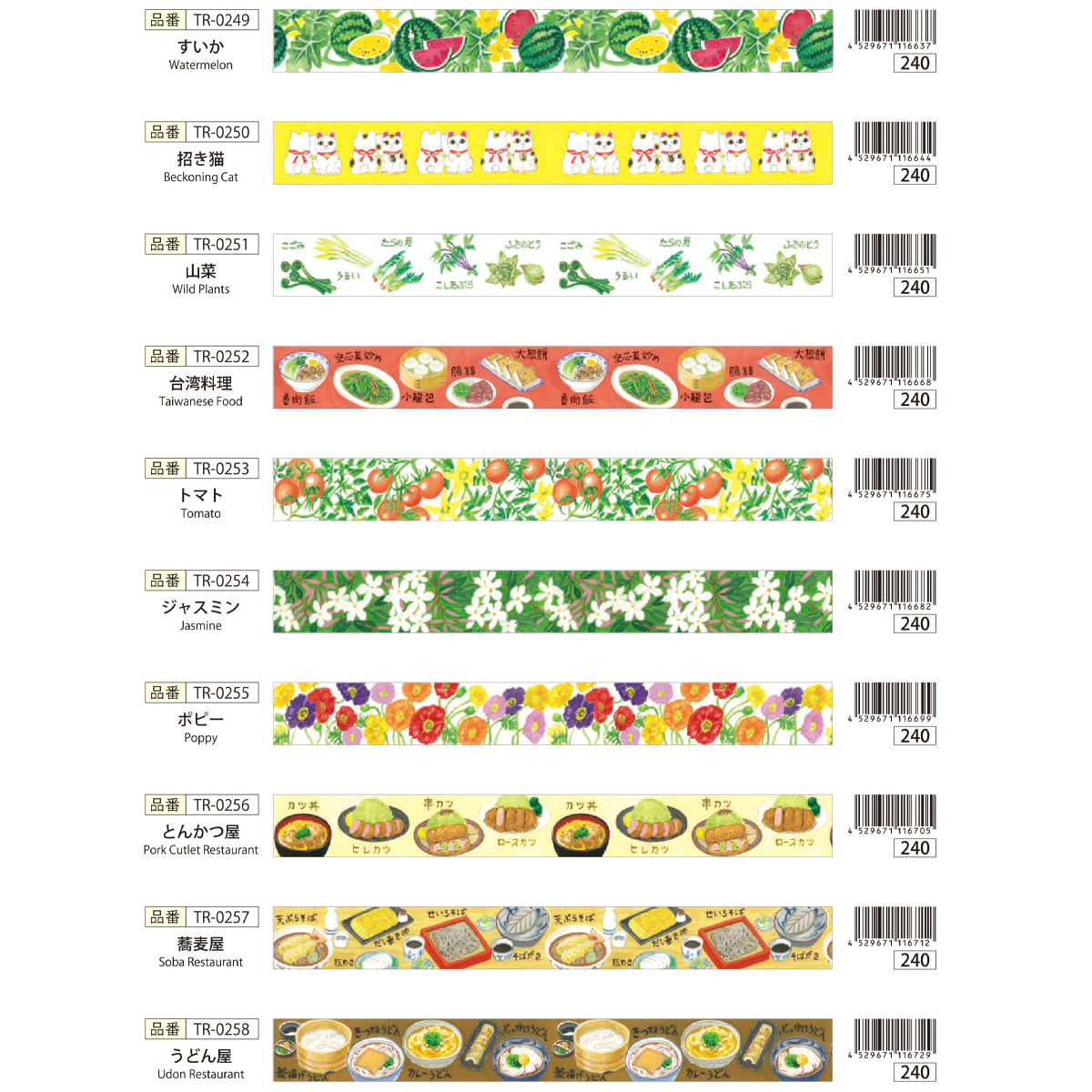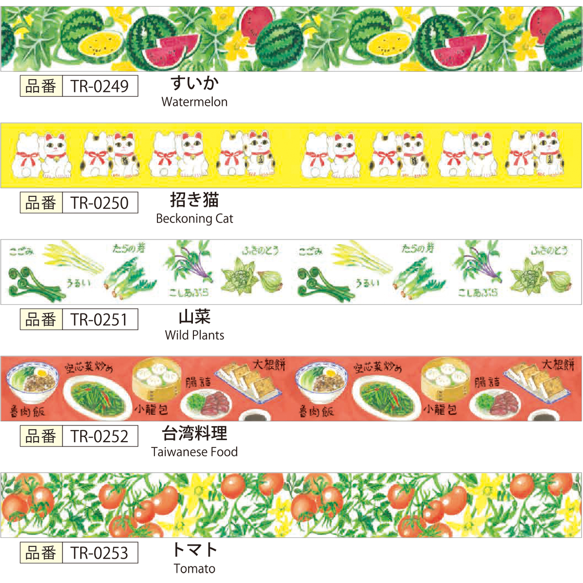 植物、食べ物、動物などのイラストを手描きで温かみの感じられるマスキングテープに仕上げました。