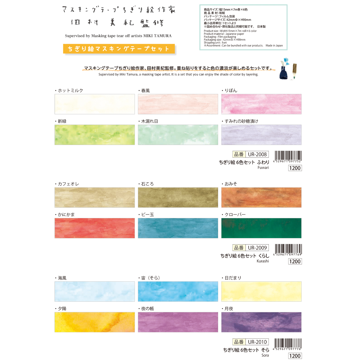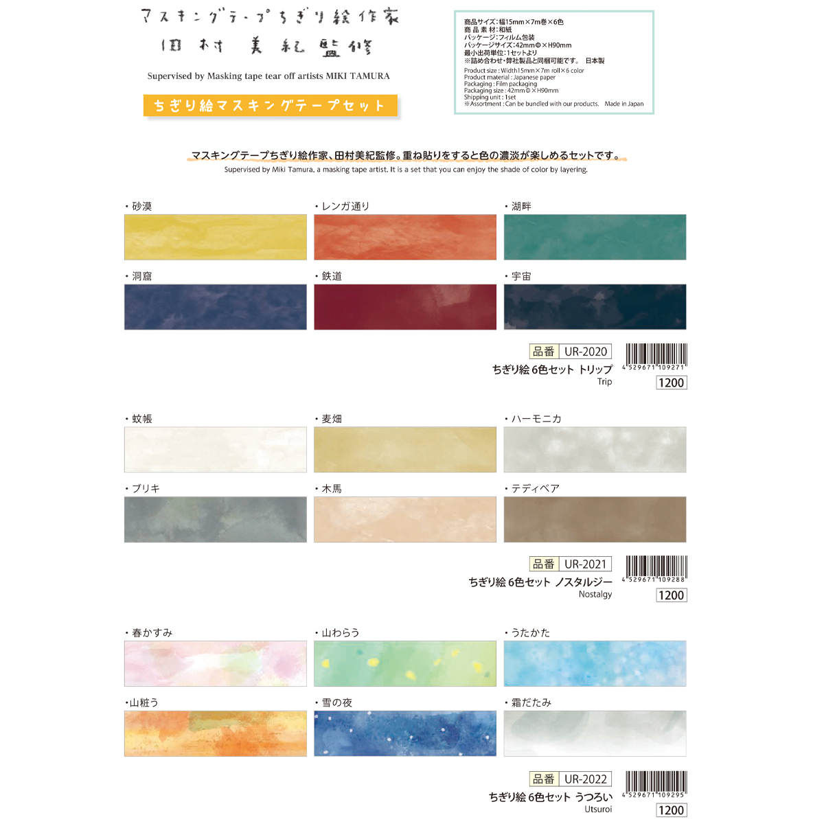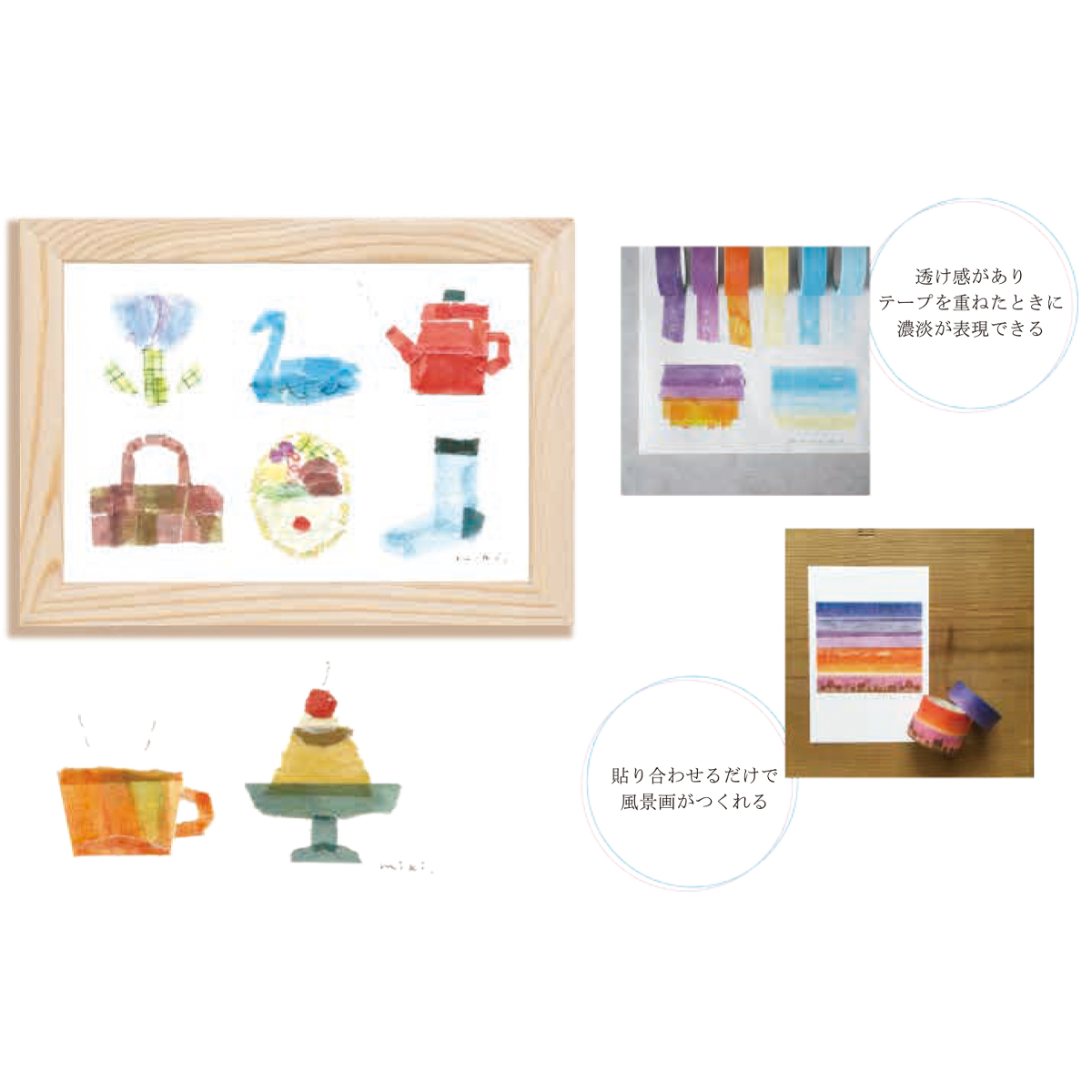 マスキングテープちぎり絵作家、田村美紀監修。重ね貼りをすると色の濃淡が楽しめるセットです。