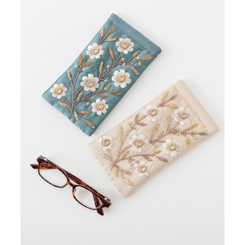 【東京かんかん】ビーズ刺繍メガネケース ベージュ&ターコイズ 眼鏡入れ ハンドメイド