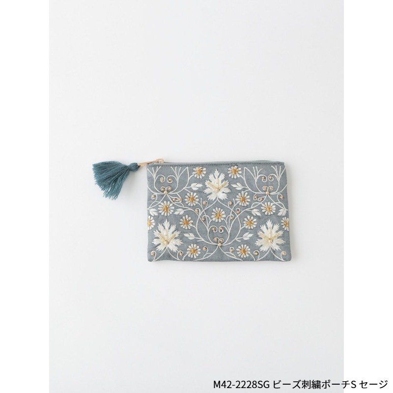 【東京かんかん】ビーズ刺繍ポーチS セージ&シルバー ハンドメイド