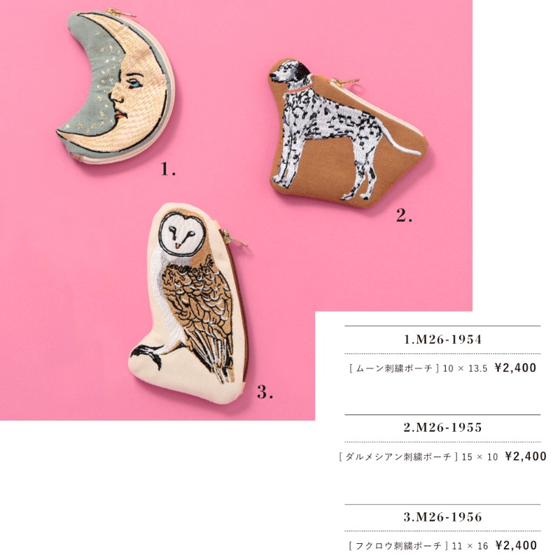 サイズ | 【M26-1954 ムーン刺繍ポーチ】10×13.5 【M26-1955 ダルメシアン刺繍ポーチ】15×10 【M26-1956 フクロウ刺繍ポーチ】11×16 |