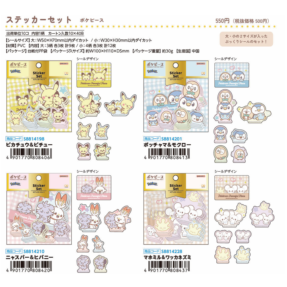 素材 | 【材質】PVC 【パッケージ】台紙付PP袋 【内容】大:3柄 各3枚 計9枚 / 小:4柄 各3枚 計12枚 |