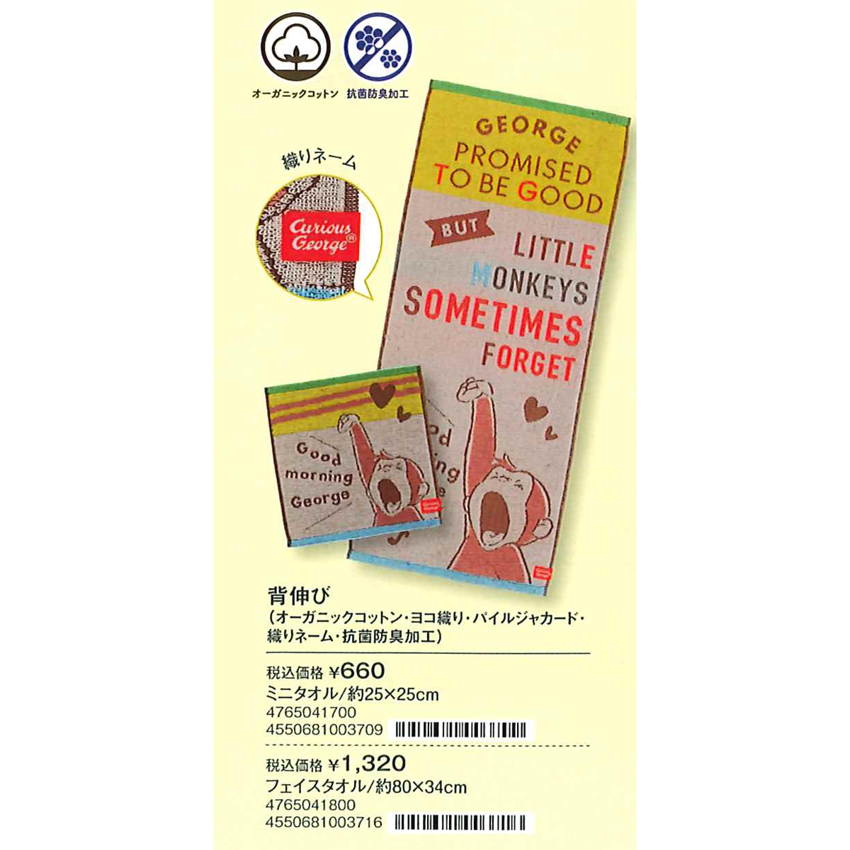 【おさるのジョージ】背伸び ミニタオル&フェイスタオル 防菌防臭加工