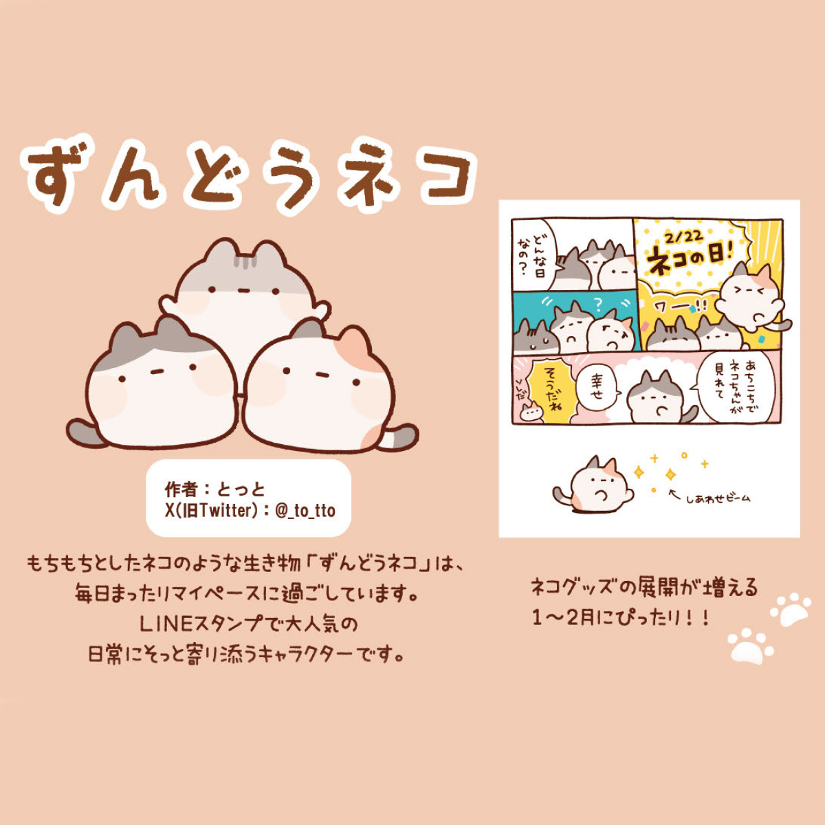 もちもちとしたネコのような生き物「ずんどうネコ」は、毎日まったりマイペースに過ごしています。