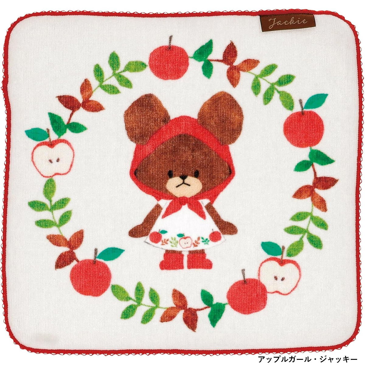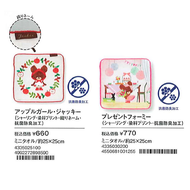 素材 | 【アップルガール・ジャッキー ミニタオル】 綿100% シャーリング・インクジェットプリント・ピコットメロー・織りネーム・抗菌防臭加工 【プレゼントフォーミー ミニタオル】 綿100% シャーリング・インクジェットプリント・抗菌防臭加工 |