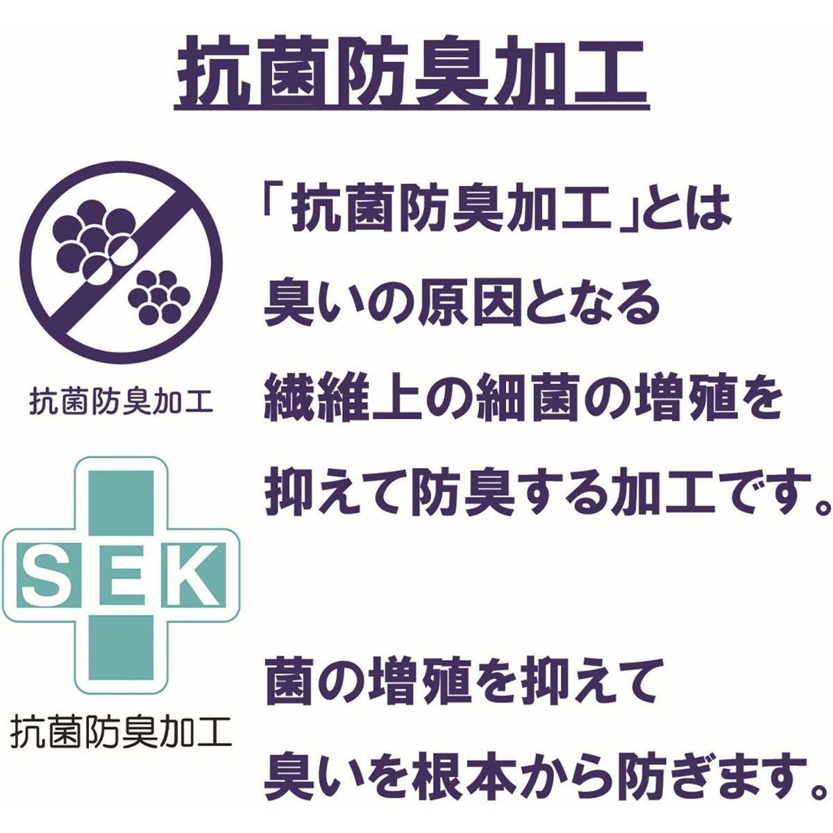 「抗菌防臭加工」とは臭いの原因となる繊維上の細菌の増殖を抑えて防臭する加工です。