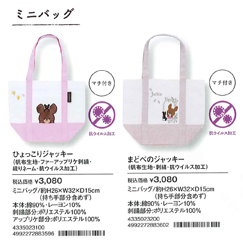 素材 | 【ひょっこりジャッキー ミニバッグ】 本体:綿90% レーヨン10% 刺繍部分:ポリエステル100% アップリケ部分:ポリエステル100% 帆布生地・ファーアップリケ刺繍・織りネーム・抗ウイルス加工 【まどべのジャッキー ミニバッグ】 本体:綿90% レーヨン10% 刺繍部分:ポリエステル100% 帆布生地・刺繍・抗ウイルス加工 |