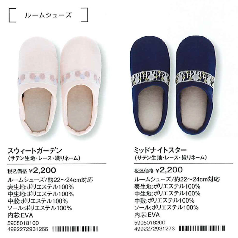 素材 | 表生地:ポリエステル100% 中生地:ポリエステル100% 中敷:ポリエステル100% ソール:ポリエステル100% 内芯:EVA サテン生地・レース・織りネーム |