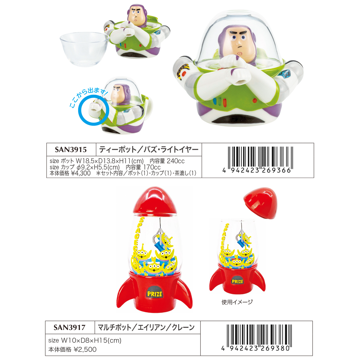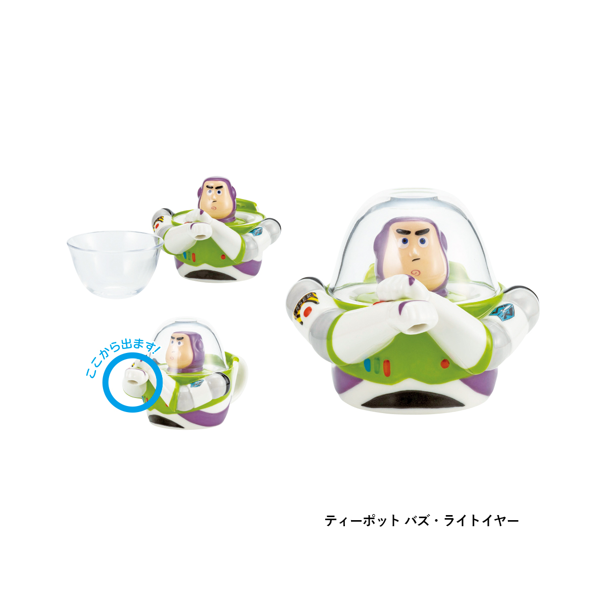 サイズ | 【ティーポット バズ・ライトイヤー】 ポット:W18.5×D13.8×H11(cm) 内容量 240cc カップ:φ9.2×H5.5(cm) 内容量 170cc セット内容:ポット(1)・カップ(1)・茶漉し(1) 【マルチポット エイリアン クレーン】 W10×D8×H15(cm) |