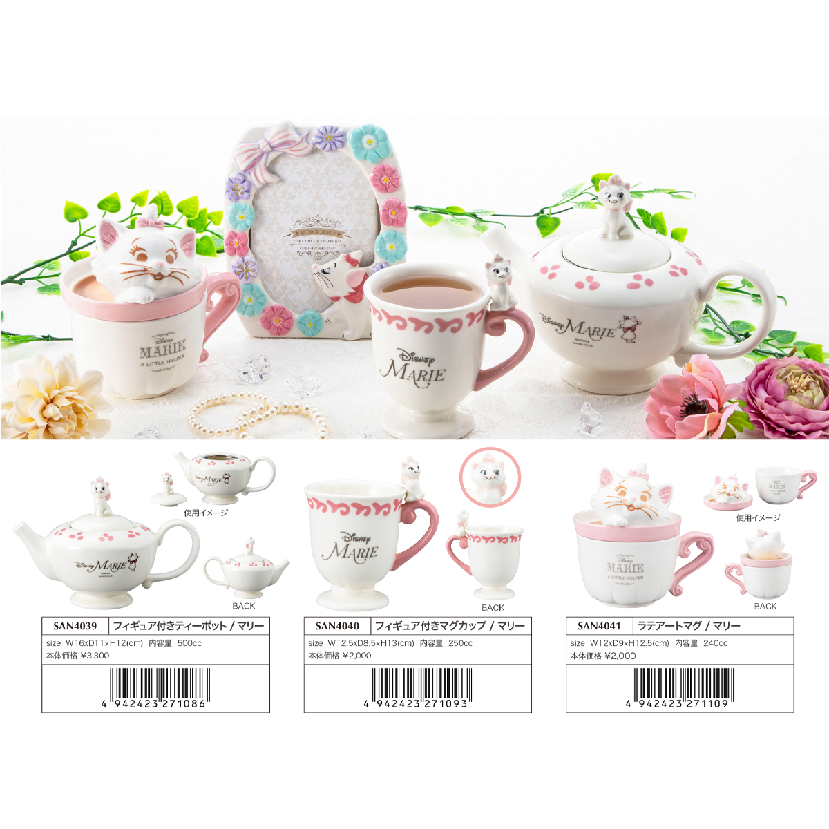 サイズ | 【フィギュア付きティーポット マリー】W16×D11×H12(cm) 内容量:500cc 【フィギュア付きマグカップ マリー】W12.5×D8.5×H13(cm) 内容量:250cc 【ラテアートマグ マリー】W12×D9×H12.5(cm) 内容量:240cc |