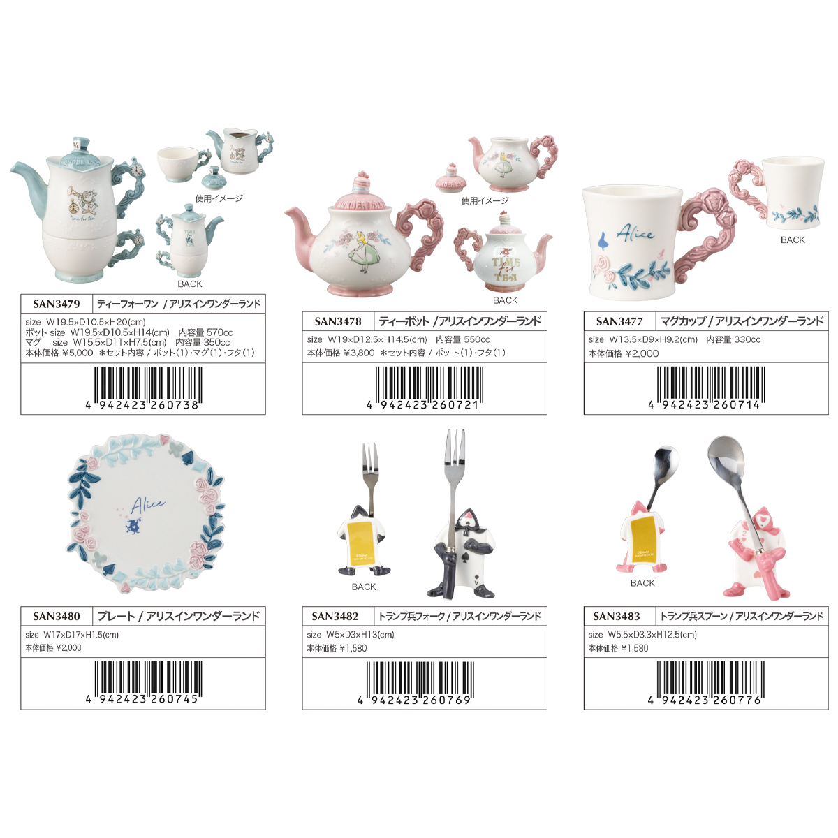 素材 | 【ティーフォーワン】磁器 【マグカップ】磁器 【ティーポット】磁器 【プレート】磁器 【トランプ兵フォーク】磁器・ステンレス 【トランプ兵スプーン】磁器・ステンレス |