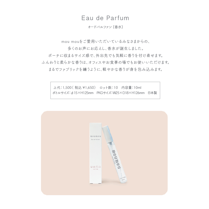 mou mouをご愛用いただいているみなさまからの、多くのお声にお応えし、香水が誕生しました。