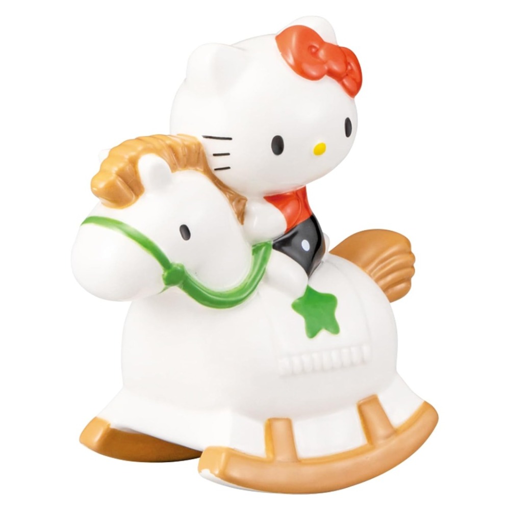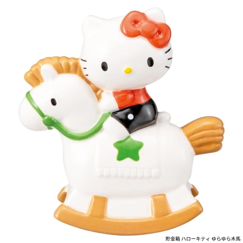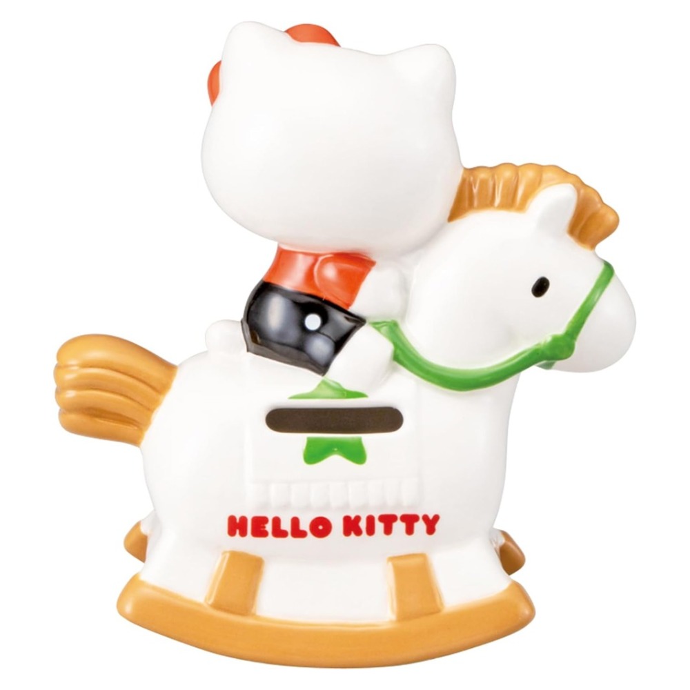 木馬に乗ったキティちゃんがゆらゆら揺れる楽しい貯金箱です。