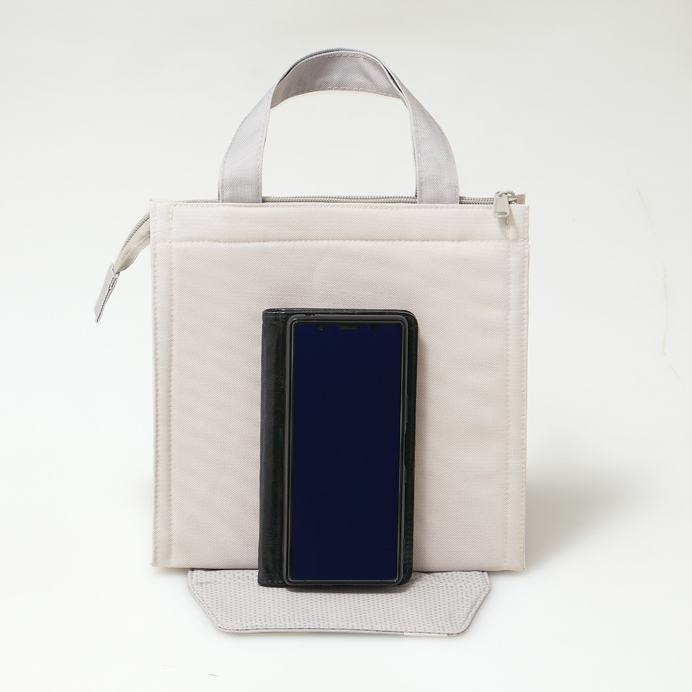 素材 | 表生地・持ち手:ポリエステル 裏生地:発泡ポリエチレン、アルミ蒸着フィルム スマホスタンド:磁石 |