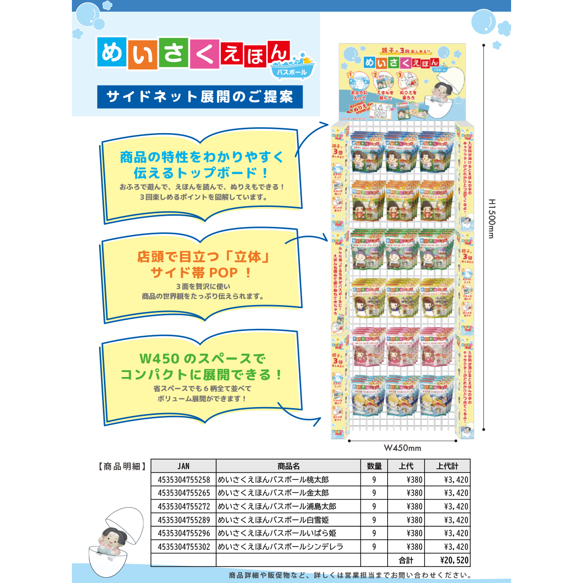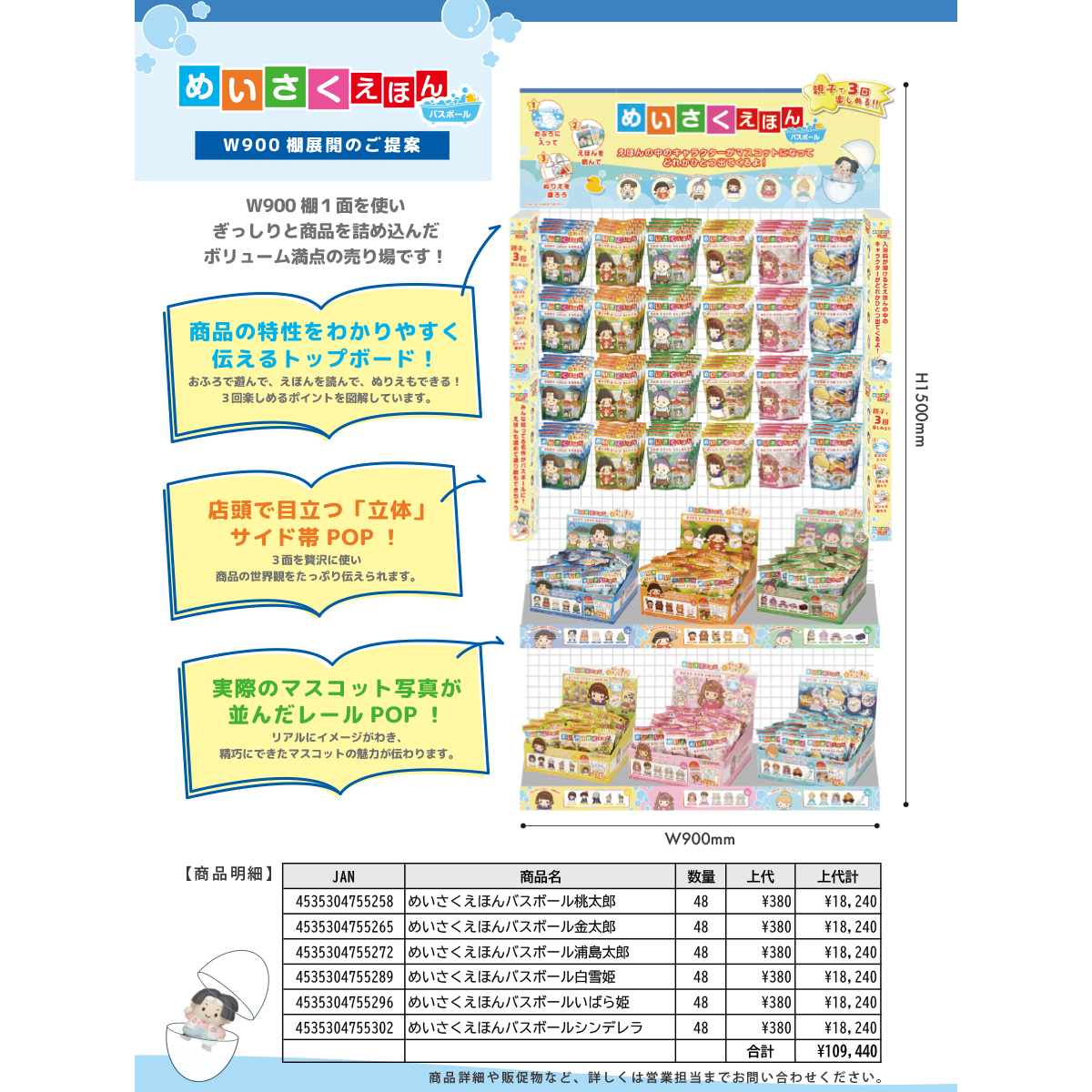 注意事項 | ![]() こちらの商品は、全6種をご注文時にご希望の場合には販促物(サイズ:W450 または W900)をお付けできます。 ご希望の際には必ずご注文時に備考欄に「販促物(サイズ)希望」とご記載ください。 後からや先の販促物のみの発送はできません。 ・W450:商品の特性をわかりやすく伝えるトップボード!店頭で目立つ「立体」サイド帯POP!W450のスペースでコンパクトに展開できる! ・W900:商品の特性をわかりやすく伝えるトップボード!店頭で目立つ「立体」サイド帯POP!実際のマスコット写真が並んだレールPOP!W900棚1面を使いぎっしりと商品を詰め込んだボリューム満点の売り場です! ※サイズが2種類あるので必ずご選択の上ご発注ください。作成にお時間がかかるため出荷までお時間を頂戴いたします。 |