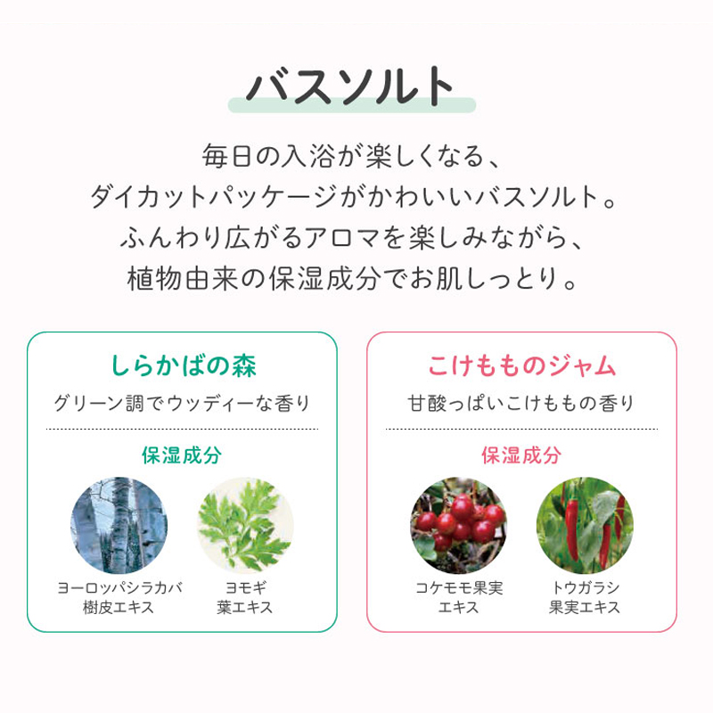 毎日の入浴が楽しくなる、ダイカットパッケージがかわいいバスソルト。