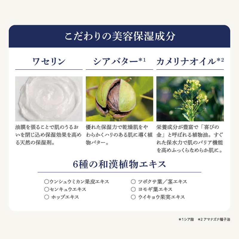 保湿、保護力に優れたワセリンに、植物由来の美用保湿成分を配合。