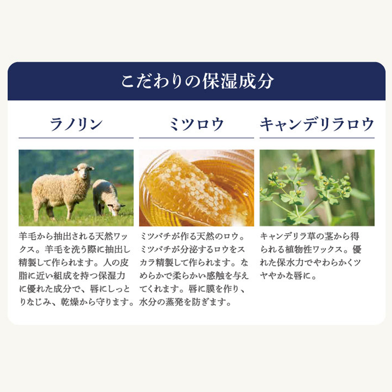 素材 | ラノリン、ミツロウ、キャンデリラロウ配合 |