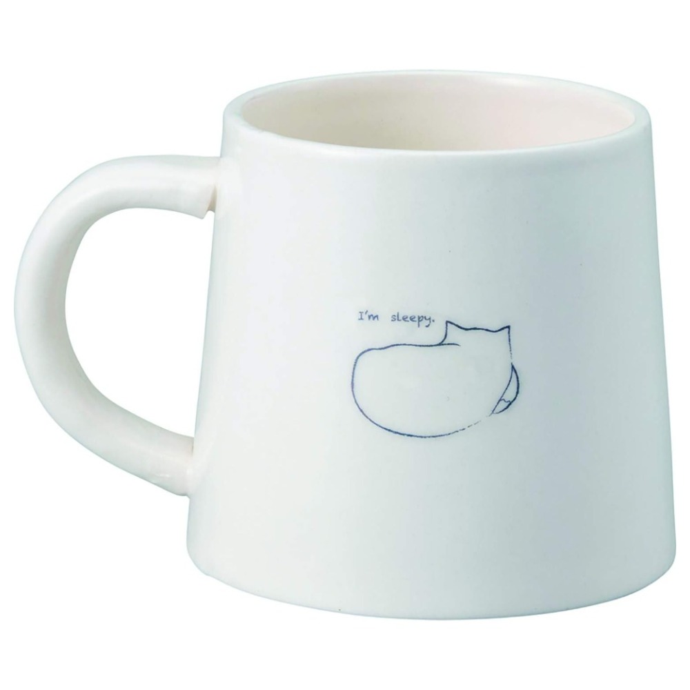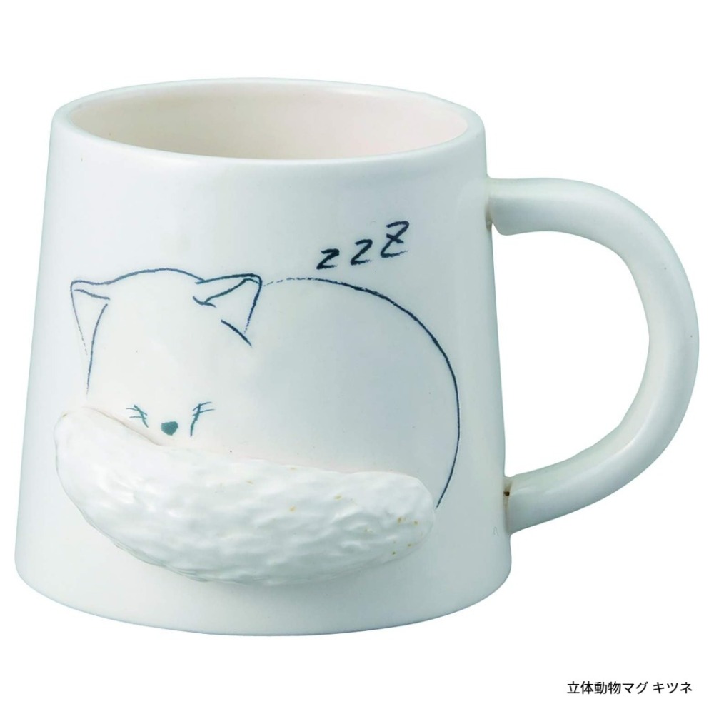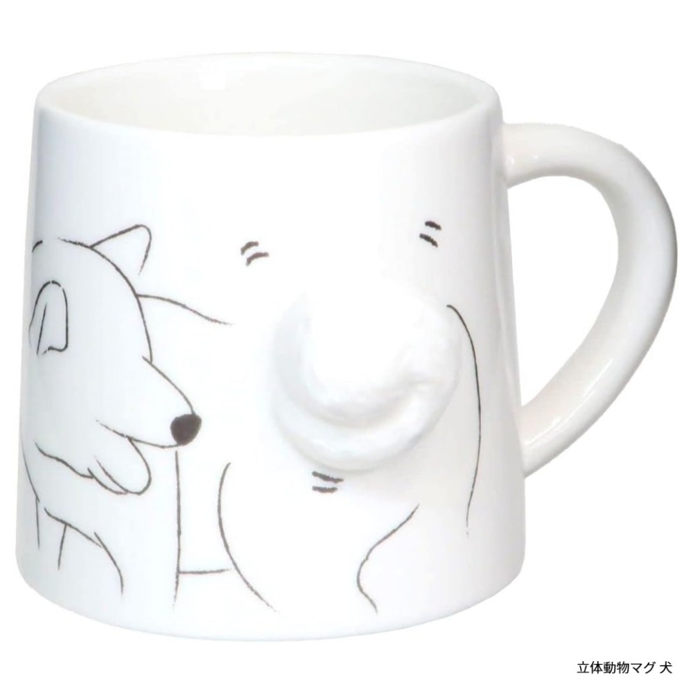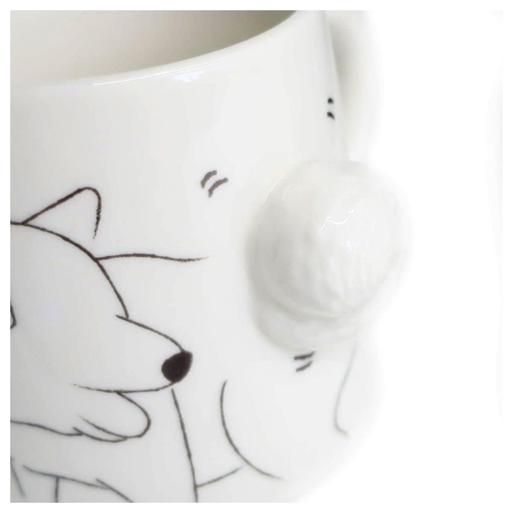 白い陶磁器製のマグカップに、黒のペンでササッと書いたかのような動物のデザインがされております。尻尾だけは立体的になっており、インテリアとしてもお使いいただけます。