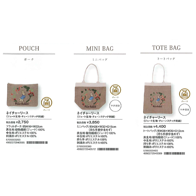 【ピーターラビット】ネイチャーリース フラットポーチ&ミニバッグ&トートバッグ ジュート素材