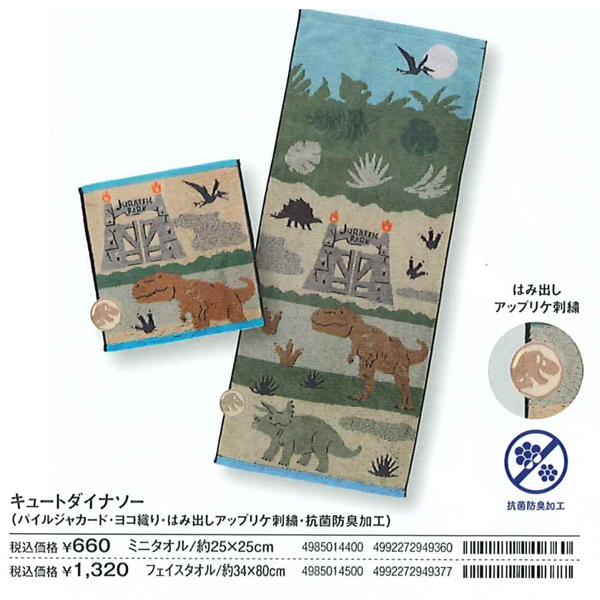 素材 | 【キュートダイナソー ミニタオル/フェイスタオル】 本体:綿100% アップリケ刺繍部分:ポリエステル100% 横織り・パイルジャカード・はみ出しアップリケ刺繍・抗菌防臭加工 【ふんわりダイナソー ミニタオル】 シャーリング・染料プリント・全面刺繍・防菌防臭加工 |