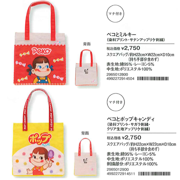 素材 | 【ペコとミルキー スクエアバッグ】 表生地:綿95% レーヨン5% 中生地:ポリエステル100% 染料プリント・サテンアップリケ刺繍 【ペコとポップキャンディ スクエアバッグ】 表生地:綿95% レーヨン5% 中生地:ポリエステル100% 刺繍部分:ポリエステル100% 染料プリント・サガラ刺繍・クリア生地アップリケ刺繍 |