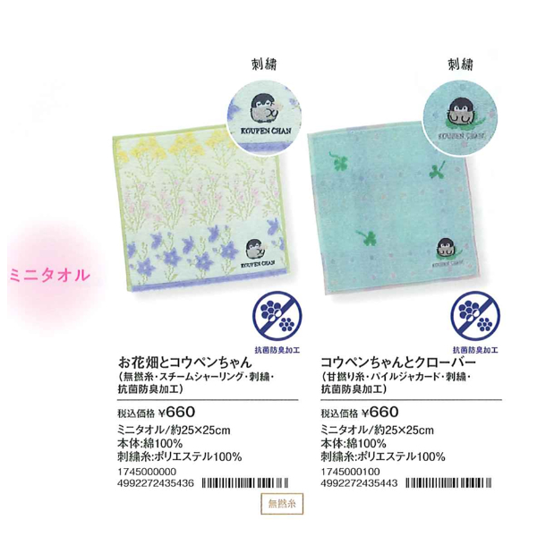 素材 | 【お花畑とコウペンちゃん ミニタオル】 本体:綿100% 刺繍糸:ポリエステル100% 無撚糸・スチームシャーリング・刺繍・抗菌防臭加工 【コウペンちゃんとクローバー ミニタオル】 本体:綿100% 刺繍糸:ポリエステル100% 甘撚糸・パイルジャカード・アップリケ刺繍・抗菌防臭加工 【おにぎりコウペンちゃん 手ぬぐい】 綿100% 岡生地・プリント |