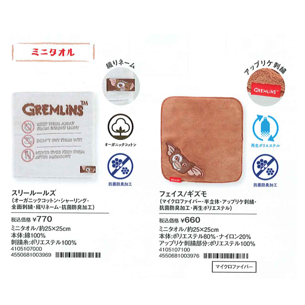 素材 | 【スリールールズ ミニタオル】 本体:綿100% 刺繍糸:ポリエステル100% オーガニックコットン・シャーリング・全面刺繍・織りネーム・抗菌防臭加工 【フェイス/ギズモ ミニタオル】 本体:ポリエステル80%・ナイロン20% アップリケ刺繍部分:ポリエステル100% マイクロファイバー・半立体・アップリケ刺繍・抗菌防臭加工・再生ポリエステル |
