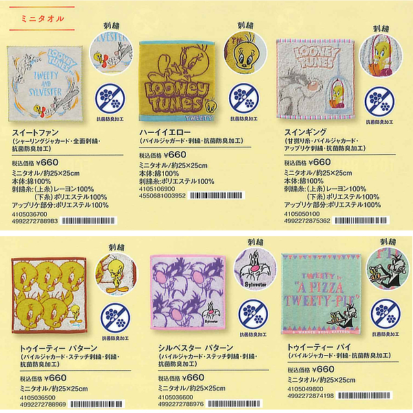 素材 | 【スイートファン ミニタオル】 本体:綿100% 刺繍糸:上糸 レーヨン100% 下糸 ポリエステル100% アップリケ部分:ポリエステル100% シャーリングジャカード・全面刺繍・抗菌防臭加工 《生産地》ベトナム 【ハーイイエロー ミニタオル】 本体:綿100% 刺繍糸:ポリエステル100% パイルジャカード・刺繍・防菌防臭加工 【スインギング ミニタオル】 本体:綿100% 刺繍糸:上糸 レーヨン100% 下糸 ポリエステル100% アップリケ部分:ポリエステル100% 甘撚り糸・パイルジャカード・アップリケ刺繍・抗菌防臭加工 《生産地》ベトナム 【トゥイーティーパターン ミニタオル】 綿100% パイルジャカード・ステッチ刺繍・刺繍・抗菌防臭加工 《生産地》日本 【シルベスターパターン ミニタオル】 綿100% パイルジャカード・ステッチ刺繍・刺繍・抗菌防臭加工 《生産地》日本 【トゥイーティーパイ ミニタオル】 綿100% パイルジャカード・刺繍・抗菌防臭加工 《生産地》日本 |