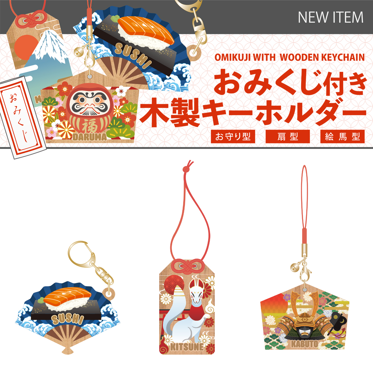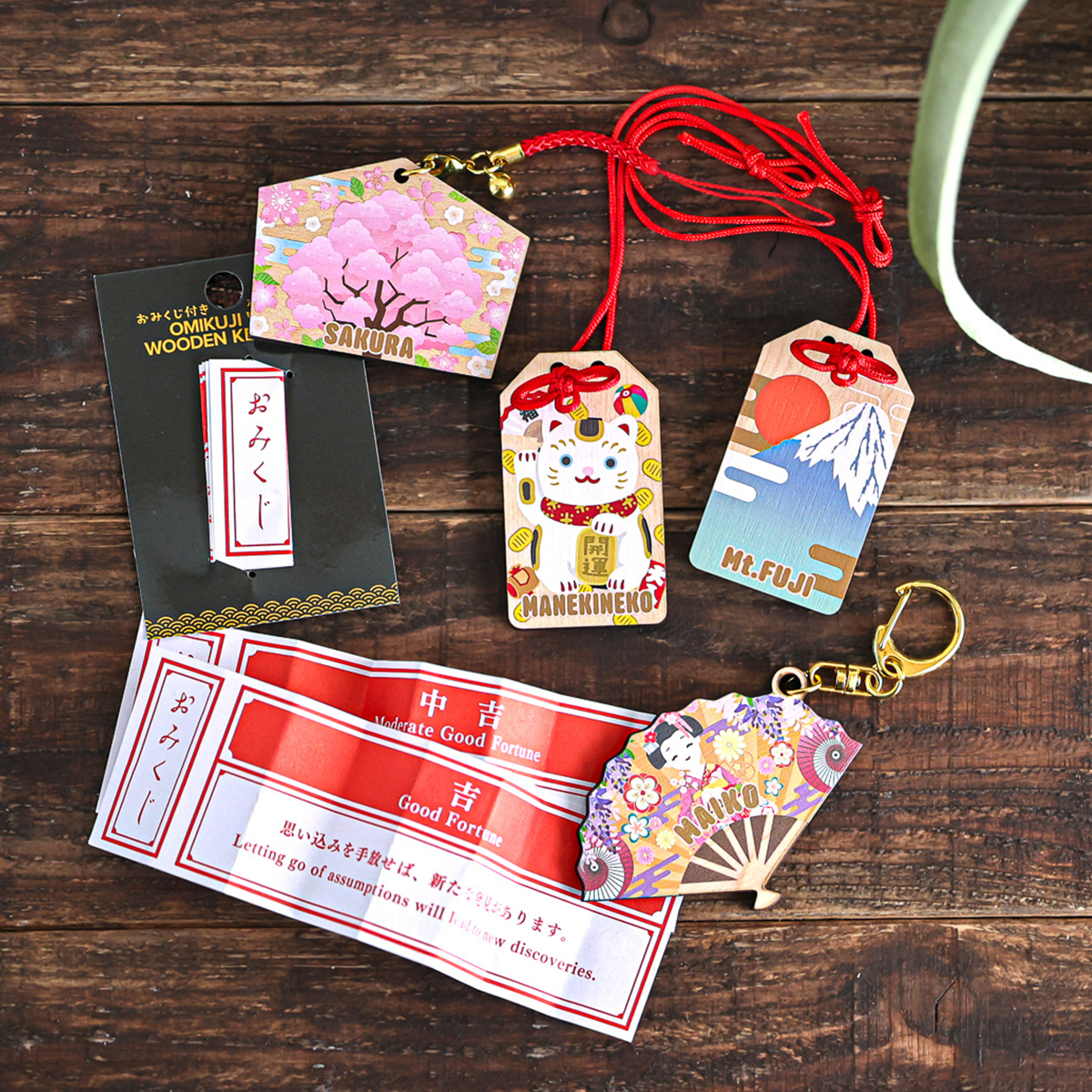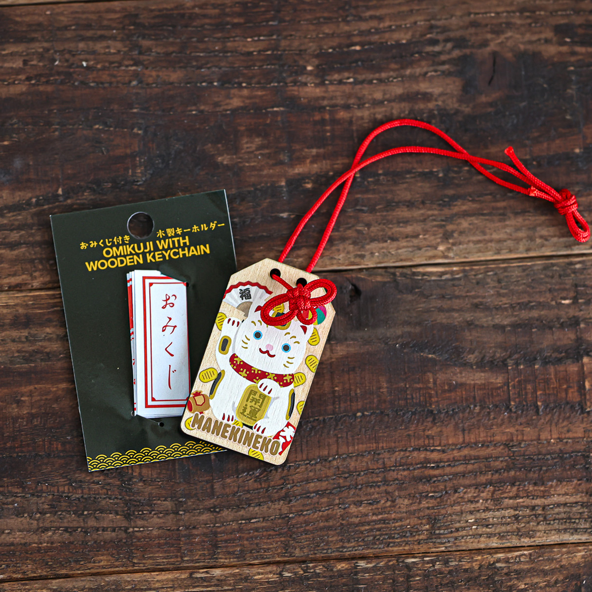 お土産にぴったり!おみくじ付きの木製キーホルダーです。