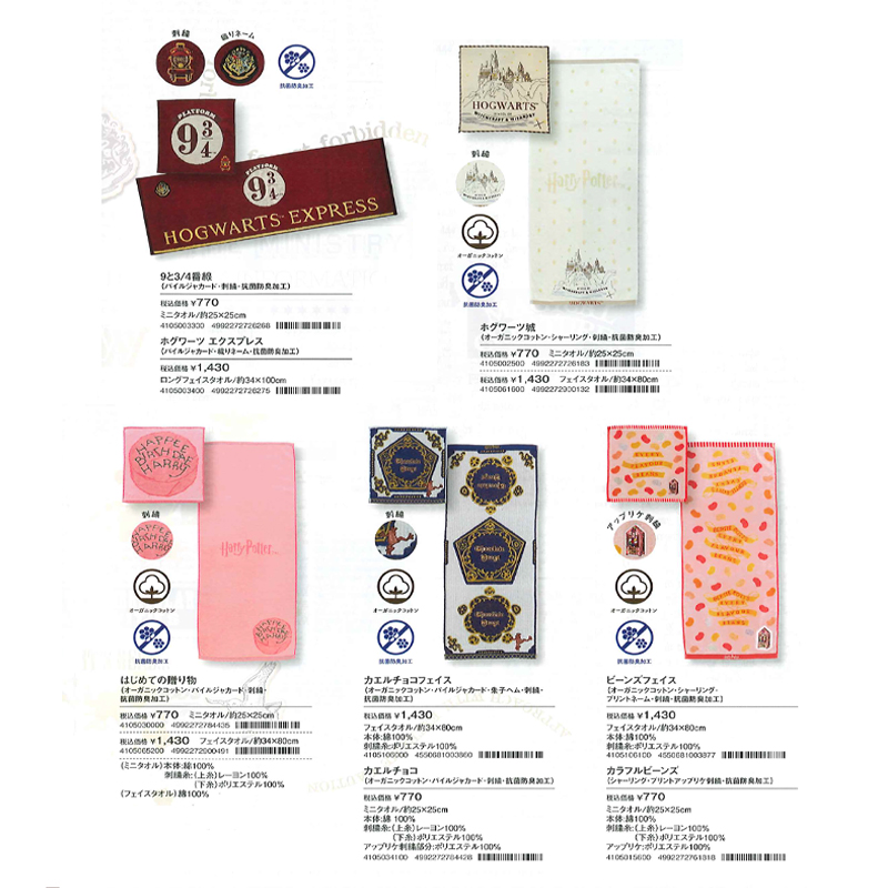 | 素材 | 【ホグワーツエクスプレス ロングフェイスタオル】 綿100% パイルジャカード・刺繍・抗菌防臭加工 【ホグワーツ城 フェイスタオル】 本体:綿100% 刺繍部分:ポリエステル100% オーガニックコットン・シャーリング・刺繍・抗菌防臭加工 【はじめての贈り物 フェイスタオル】 綿100% オーガニックコットン・パイルジャカード・刺繍・抗菌防臭加工 【カエルチョコフェイス フェイスタオル】 本体:綿100% 刺繍糸:ポリエステル100% パイルジャカード・朱子ヘム・刺繍・抗菌防臭加工 【ビーンズフェイス フェイスタオル】 本体:綿100% 刺繍糸:ポリエステル100% オーガニックコットン・シャーリング・朱子ヘム・プリントネーム・刺繍・抗菌防臭加工 |